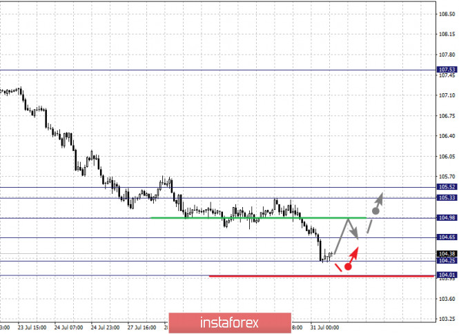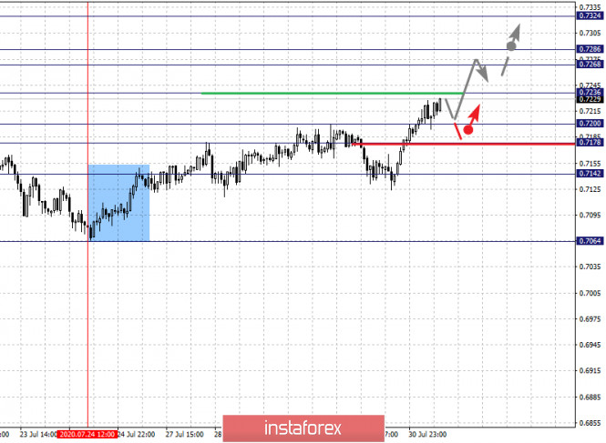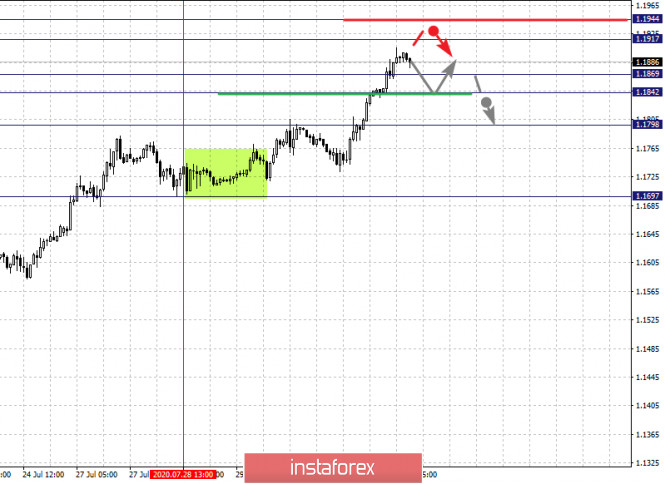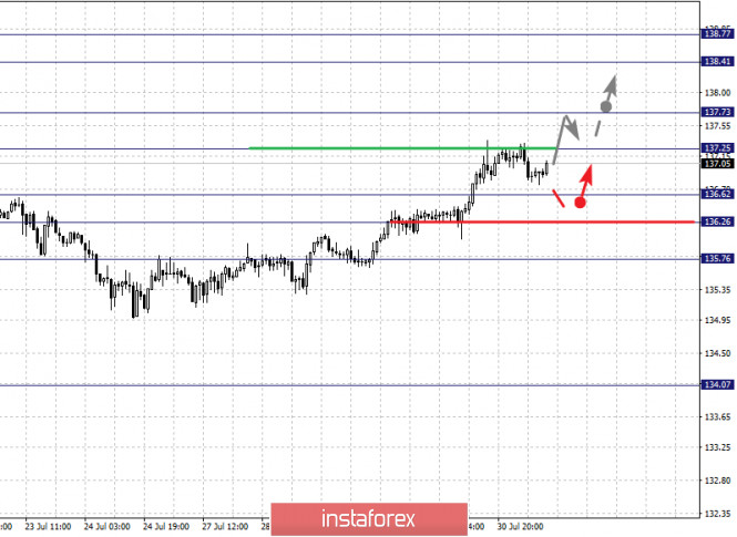 Фрактальный анализ по основным валютным парам на 31 июляИнстаФорекс - Instaforex, 5 лет назад Здравствуйте, уважаемые коллеги. По паре Евро/Доллар ожидаем ключевой разворот к низу из диапазона 1.1917 – 1.1944 или ранее данных значений. По паре Фунт/Доллар цена находится возле предельных значений для верха, в связи с чем ожидаем уход в коррекцию, уровень 1.3054 ключевое сопротивление для низа. По паре Доллар/Франк цена находится возле предельных значений для нисходящей структуры, в связи с чем ожидаем откат кверху. По паре Доллар/Иена ожидаем уход в коррекцию, уровень 104.65 ключевое сопротивление для верха. По паре Евро/Иена цена находится в равновесном состоянии, пробой уровня 124.26 приведет к развитию восходящей тенденции. По паре Фунт/Иена продолжения движения кверху ожидаем после пробоя 137.25, уровень 136.26 ключевая поддержка. Прогноз на 31 июля: Аналитический обзор валютных пар в масштабе Н1: По паре Евро/Доллар ключевыми уровнями в масштабе Н1 являются: 1.1944, 1.1917, 1.1869, 1.1842 и 1.1798. Здесь мы следим за локальной восходящей структурой от 28 июля, из диапазона 1.1917 – 1.1944 ожидаем ключевой разворот книзу. Краткосрочное нисходящее движение ожидаем в коридоре 1.1869 – 1.1842, пробой последнего значения приведет к развитию коррекции, здесь первая цель – 1.1798, этот уровень является ключевым сопротивлением для нисходящей тенденции, его пробой позволит рассчитывать на движение к потенциальной цели – 1.1697. Основная тенденция – локальная восходящая структура от 28 июля, ожидаем уход в коррекцию Торговые рекомендации: Buy: 1.1918 Take profit: 1.1942 Buy: Take profit: Sell: 1.1869 Take profit: 1.1842 Sell: 1.1840 Take profit: 1.1798 По паре Фунт/Доллар ключевыми уровнями в масштабе Н1 являются: 1.3189, 1.3145, 1.3054, 1.2996 и 1.2943. Здесь цена подошла к предельным значением для восходящего цикла от 14 июля, из коридоре 1.3145 – 1.3189 ожидаем ключевой разворот к низу. Уровень 1.3054 является ключевой поддержкой для верха, его пробой приведет к движению до уровня 1.2996. Потенциальным значением для низа пока считаем уровень 1.2943, до которого ожидаем оформления начальных условий для нисходящего цикла. Основная тенденция – восходящий цикл от 14 июля, ожидаем уход в коррекцию. Торговые рекомендации: Buy: 1.3145 Take profit: 1.3187 Buy: Take profit: Sell: 1.3054 Take profit: 1.2998 Sell: 1.2994 Take profit: 1.2944 По паре Доллар/Франк ключевыми уровнями в масштабе Н1 являются: 0.9206, 0.9159, 0.9127, 0.9089 и 09067. Здесь цена находится возле предельных значений для нисходящего цикла от 16 июля, в связи с чем из диапазона 0.9067 – 0.9089 мы ожидаем ключевой разворот кверху. Краткосрочное восходящее движение возможно в коридоре 0.9127 – 0.9159, пробой последнего значения позволит рассчитывать на движение к потенциальной цели – 0.9206, до этого уровня ожидаем оформления начальных условий для восходящего цикла. Основная тенденция – нисходящая структура от 16 июля, ожидаем уход в коррекцию Торговые рекомендации: Buy: 0.9100 Take profit: 0.9126 Buy: 0.9128 Take profit: 0.9159 Sell: Take profit: Sell: Take profit: По паре Доллар/Иена ключевыми уровнями в масштабе являются: 105.52, 105.33, 104.98, 104.65, 104.25 и 104.01. Здесь мы следим за развитием нисходящей структуры от 20 июля, из диапазона 104.25 – 104.01 ожидаем ключевой разворот в коррекцию. Краткосрочное восходящее движение возможно в диапазоне 104.65 – 104.98, пробой последнего значения приведет к движению до потенциальной цели - 105.33. Диапазон 105.33 – 105.52 шумового, до него ожидаем оформления начальных условий для восходящего цикла. Основная тенденция: нисходяща