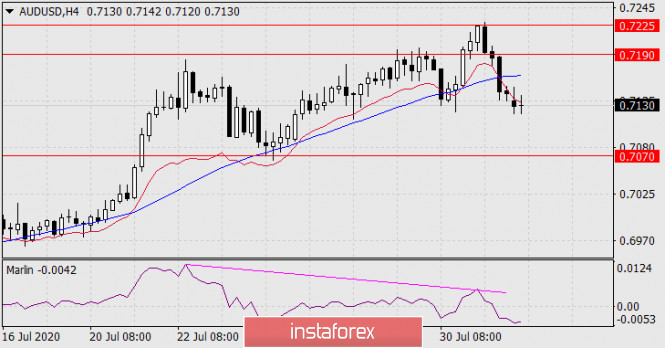 В пятницу 31-го июля австралийский доллар совершил последний бросок к верхней границе целевого диапазона 0.7190-0.7225 и, развернувшись вниз, закрыл день понижением на 50 пунктов. Тройная дивергенция цены с осциллятором Марлин на дневном масштабе сформирована полностью. Теперь ждём снижения цены к линии Крузенштерна, в район уровня 0.6960. Закрепление цены под линией Крузенштерна запустит тренд на среднесрочное понижение.