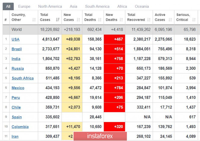 Торговый план 03.08.2020. EURUSD. Covid19 – замедление. Важные новости по СШАИнстаФорекс - Instaforex, 5 лет назад Covid19 в мире - замедление. В трёх странах, которые остаются долгое время лидерами пандемии - США, Бразилия, Индия - есть спад за последние сутки. (В Индии - незначительный). Возможно, это связано с выходным днем - в прошлом спады в воскресенье уже отмечались. Тем не менее вторая волна пандемии находится по-прежнему на максимуме, во многих странах отмечена вторая волна. Есть рост в некоторых странах Европы - в Германии, Украине. В России медленный спад пандемии, число новых случаев снизилось до примерно +5400 в сутки. EURUSD: На новой неделе - важные новости по США: в среду и пятницу - отчет по занятости за июль. Важный вопрос - на каком уровне стабилизируется безработица? Мы готовы купить евро от 1.1700 и ниже. Евро остается в состоянии тренда наверх. Материал предоставлен компанией InstaForex - www.instaforex.com |
