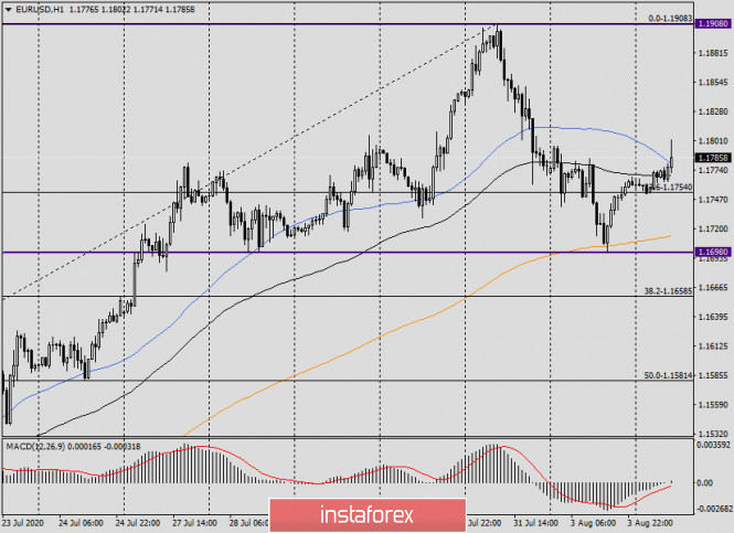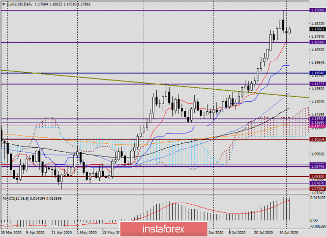 Анализ и прогноз по EUR/USD на 4 августа 2020 годаИнстаФорекс - Instaforex, 5 лет назад Здравствуйте, уважаемые коллеги! На торгах первого дня этой недели доллар США укрепился по отношению ко всем основным конкурентам, за исключением канадского доллара. Впрочем, укрепление американской валюты носило неоднозначный характер и разный масштаб. Об этом более подробно поговорим в технической части обзора, а пока немного о вчерашней и сегодняшней макроэкономической статистике. Как вчера стало известно, промышленное производство в зоне евро выросло больше, чем того ожидали аналитики: прогноз 51.1, а по факту 51.8. Напомню, что значение индекса деловой активности в производственном секторе выше пятидесяти является положительным фактором. Впрочем, такой результат особого удивления не вызывает. После снятия ограничений и возобновления работы практически всех предприятий, рост промпроизводства, причём не только в еврозоне, но и в Германии, вполне ожидаем и даже закономерен. В свою очередь, деловая активность в Соединённых Штатах Америки и расходы на строительство в этой стране, опубликованные вчера, оказались хуже ожиданий экспертов. Думаю, что и здесь удивляться особо не приходится, так как COVID-19 продолжает свирепствовать в США. В стране инфицировано более 4.5 миллиона человек, при этом суточный прирост заболевших колеблется в районе 70 тысяч. По данным на вчерашний вечер, число погибших в США от COVID-19 насчитывает уже более 155 000. Весьма печальная и удручающая статистика. Властям Соединённых Штатов никак не удаётся обуздать коварную пандемию, причём уже довольно длительное время. Конечно, в такой ситуации администрация Белого дома и президент США Дональд Трамп находятся под огнём критики, особенно со стороны демократов. Ещё раз напомню, что 45-й президент США никогда не был сторонником введения жёстких ограничительных мер для локализации распространения коронавируса. Трамп больше беспокоился о состоянии американской экономики, которую заложил в основу угла своего переизбрания на второй президентский срок, и здесь он явно просчитался. Мало сомнений в том, что на выборах ему припомнят и количество погибших от COVID-19 и его легкомысленное отношение к пандемии. Если учесть ещё и беспорядки вспыхнувшие в США после убийства полицейскими афроамериканца, шансы Дональда Трампа на переизбрание, по моему личному мнению, минимальны. Однако это уже совсем другая история, а мы вернёмся к рассмотрению валютной пары евро/доллар. Заглянув в сегодняшний экономический календарь, видим, что он небогат на макроэкономические события. Еврозона в 12:00 (мск) опубликует индекс цен производителей. В свою очередь, Соединённые Штаты в 17:00 (мск) представят отчёты по производственным заказам. Daily Как и предполагалось во вчерашнем обзоре по главной валютной паре рынка Forex, пятничная свеча «Медвежье поглощение» не осталась незамеченной участниками рынка, и её начали отыгрывать. Однако снижение было остановлено уже на 1.1698, после чего курс начал активно восстанавливаться, и торги 3 августа завершились на уровне 1.1760. Сегодня в моменте написания пара растёт и торгуется вблизи 1.1793, демонстрируя намерения вернуться выше важного технического уровня 1.1800. Стоит отметить, что вчера сильную поддержку цене оказала линия Тенкан (красная) индикатора Ишимоку, а также ещё один значимый техничес