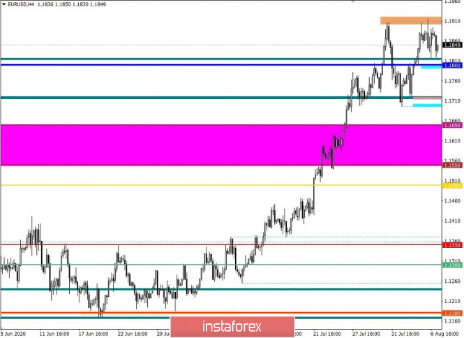 Торговые рекомендации по валютной паре EURUSD – перспективы дальнейшего движенияИнстаФорекс - Instaforex, 5 лет назад Торговая неделя подходит к концу, и нам пора подвести предварительные итоги. Коррекционный ход, заданный рынком в минувшую пятницу, был полностью отыгран в течение последующих трех дней, где трейдеры попытались пробить район взаимодействия торговых сил 1,1900/1,1920, но заход не дал должных результатов. Котировка остановилась, а локальные максимумы перестали обновляться. Неужели это конец долгоиграющей восходящей инерции? - задаются вопросом участники рынка. Перекупленность европейской валюты у всех на слуху, но виновник сего торжества не евро, а доллар, который по всем фронтам рынка Forex терял позиции. Тем самым, для того чтобы нормализовать ситуацию, рынок должен изменить позицию по американскому доллару, иначе это не последний локальный максимум, который стоит на пути инерционного восходящего хода цены. Спекулянтам же данная ситуация устаревает как никогда, и здесь не имеет значения, что среднесрочный тренд изменил направление, рынок просто находится на эмоциях, и этого достаточно. Разбирая поминутно минувший день, можно увидеть, что попытка пробоя района 1,1900/1,1920 была зафиксирована в период старта европейской сессии, но кроме прокола тенями ничего больше не было. Взаимодействие торговых сил сделало свою работу, объем длинных позиций незамедлительно сократился, а котировка евро/доллар откатилась в сторону 1,1818. В плане динамики фиксируется показатель 97 пунктов, что на 16% выше среднесуточного значения, 83 ---> 97. Уже как полторы недели мы наблюдаем за ускорением, где даже в момент застоя на рынке динамика не снижается, что говорит о высоком спекулятивном ажиотаже. Как обсуждалось в предыдущем обзоре, трейдеры ожидали фиксацию цены выше чем 1,1920 для подтверждения сигнала о покупке в сторону психологического уровня 1,2000, чего так и не произошло на рынке. Альтернативный сценарий, который рассматривает коррекционный ход как возможная перспектива на фоне колоссальной перекупленности, по-прежнему актуален среди трейдеров. Рассматривая торговый график в общем плане (дневной период), видно, что котировка все еще находится на волне восходящей инерции, где с начала июля европейской валюте удалось набрать в весе больше 700 пунктов, не имея при этом коррекционного хода. Новостной фон минувшего дня имел в себе еженедельные данные по заявкам на пособие по безработице в Соединенных Штатах, которые вышли лучше прогноза. Первичные заявки вместо роста с 1 434 000 до 1,450 000 отразили снижение до 1 186 000, а число повторных заявок на пособие и вовсе сократились на 808 тыс. с 16 915 000 до 16 107 000 при прогнозе снижения до 16 900 000. На таком положительном фоне американский доллар имел локальное укрепление, но не существенное по масштабам общей динамики. В плане информационного фона мы продолжаем наблюдать за волнением политиков относительно ситуации с коронавирусой инфекцией, которую до сих пор не удалось взять под полный контроль. Члены комитета ФРС практически на ежедневной основе говорят о возможных рисках и еще большем замедлении экономики, если ситуация с COVID-19 не изменится. «Проблема с ускорением распространения вируса заключается в том, что он замедлил или несколько приглушил восстановление, которого мы ожидали», – сказал в интервью CNN глава ФРБ Далл