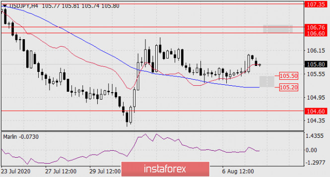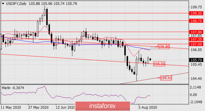 Прогноз по USD/JPY на 10 августа 2020 годаИнстаФорекс - Instaforex, 5 лет назад USD/JPY Но восходящая тенденция всё же не закреплена с технических позиций; осциллятор Марлин не вышел из зоны отрицательных значений, цена не выше индикаторной трендовой линии Крузенштерна, поэтому в случае закрепления цены под поддержкой 105.50 вероятно дальнейшее снижение к локальной и временной линии ценового канала на отметке 104.45.