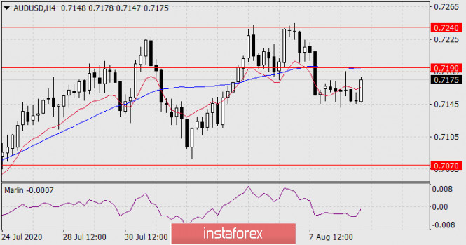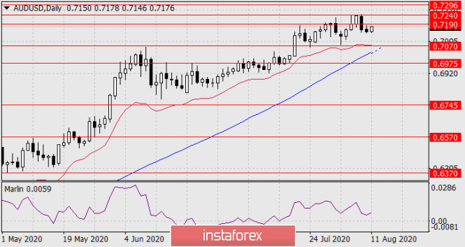 Прогноз по AUD/USD на 11 августа 2020 годаИнстаФорекс - Instaforex, 5 лет назад AUD/USD Теперь перед «австралийцем» цель 0.7070 – экстремумы 3 августа и 10 июня. Вероятно, цена на данном уровне также встретится с линией Крузенштерна на дневном масштабе, которая стремится к нему. Также в этот же момент сигнальная линия осциллятора Марлин будет бороться с границей, отделяющей зону роста от зоны снижения. Уровень 0.7070, таким образом, приобретает стратегическое значение. После закрепления цены под ним открывается среднесрочная понижающаяся тенденция с первой целью 0.6975.