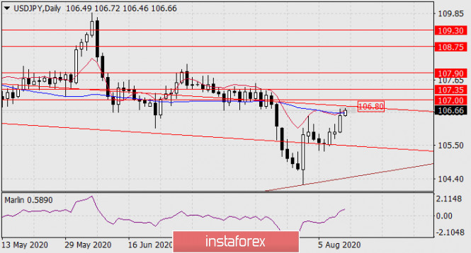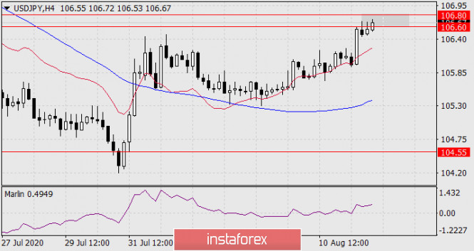 Прогноз по USD/JPY на 12 августа 2020 годаИнстаФорекс - Instaforex, 5 лет назад USD/JPY Сильный выход осциллятора Марлин в зону положительных значений придаёт цене бодрость и оптимизм в преодолении указанного диапазона сопротивлений. С выходом цены над его верхнюю границу 106.80 откроется ближняя цель 107.00. Достижение следующей цели 107.35 сопряжено с трудностями, так как в диапазоне 107.00/35 была двухнедельная консолидация с 9 по 23 июля. Для преодоления её валютной паре нужна сильная внешняя поддержка – рост американского фондового рынка. Но вчера он был не в лучшей форме, S&P500 снизился на 0,80%.