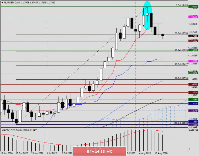 Анализ и прогноз по EUR/USD на 12 августа 2020 годаИнстаФорекс - Instaforex, 5 лет назад Здравствуйте, уважаемые коллеги! Несмотря на урон, который понесла экономика стран еврозоны из-за пандемии COVID-19, настроения в деловой среде Германии и еврозоны улучшились сильнее прогнозов аналитиков. Так, индекс настроений в деловой среде от института ZEW в Германии составил 71.5 (прогноз 58), а в еврозоне аналогичный индекс вырос до 64, при том что предыдущий показатель был на уровне 59.6. В то же время цены производителей в Соединённых Штатах Америки также оказались лучше прогнозных значений. Все цифры по этим и другим показателям можно найти в экономическом календаре. Таким образом, все вчерашние макроэкономические отчёты из еврозоны и США оказались в зелёной зоне, что внесло некоторую неопределённость в ряды участников рынка и в ценовое движение главной валютной пары рынка Forex. Daily Однако статистика остаётся статистикой, но технические факторы никто не отменял, и они, на мой взгляд, стали решающими на вчерашних торгах по EUR/USD. Впрочем, не только на вчерашних, всегда отдавал предпочтение именно технике, и она отрабатывается куда чаще и надёжней, чем макроэкономическая статистика. Особенно такая тенденция характерна для последнего времени, когда фундаментальные факторы зачастую попросту игнорируются участниками рынка. Гораздо в меньшей степени такая ситуация наблюдается с технической составляющей. Итак, вчерашнее предположение, что пара встретит сильное сопротивление вблизи 1.1800, где проходит линия Тенкан индикатора Ишимоку, и рекомендации пробовать отсюда продажи, оказались абсолютно верными. Евробыки вознамерились было вернуть котировку к росту, но, встретив сильное сопротивление продавцов на 1.1807, отступили. Медведи вернули курс к цене открытия торгов 11 августа, и в результате на дневном графике появилась бестелесная свеча дожи с гораздо более длинной верхней тенью. По моему личному мнению, такая свеча просигнализировала о текущей слабости покупателей и неспособности быков по евро/доллару продолжить подъём котировки. На момент написания данной статьи EUR/USD демонстрирует незначительное снижение и торгуется вблизи 1.1712. Полагаю, что сегодня будет проверена на прочность поддержка в районе 1.1700. Если продавцам удастся переписать минимумы торгов 3 августа, на 1.1698, их следующими целями станут отметки 1.1640, 1.1600 и 1.1585, где проходит синяя линия Киджун. В случае появления вблизи перечисленных уровней разворотных бычьих свечей, возможна ещё одна попытка игроков на повышение курса евро возобновить восходящее движение. Однако, учитывая силу сопротивления, которую оказывает линия Тенкан, сделать это будет весьма проблематично. Только закрытие торгов выше Тенкан и 1.1807 вернёт по главной валютной паре актуальность бычьего сценария. Пока же нисходящая направленность инструмента выглядит более реальной. Н4 На этом таймфрейме видим, что попытки роста остановила 50 простая скользящая средняя (1.1797), после чего пара развернулась на снижение и в моменте завершения статьи тестирует на пробой чёрную 89 экспоненциальную скользящую среднюю. Если цена пробьёт 89 ЕМА и поддержку 1.1698, на откате к пробитому уровню и 89 экспоненте можно попробовать продать пару с ближайшей целью 1.1640. Как уже обозначалось выше, более дальними целями продавцов станут 1.1600 и 1.1585. Н1 По более выгодн