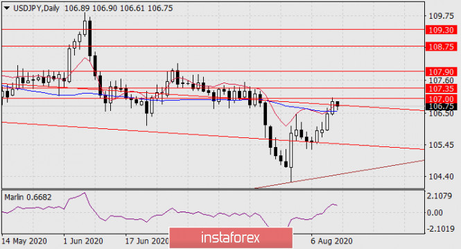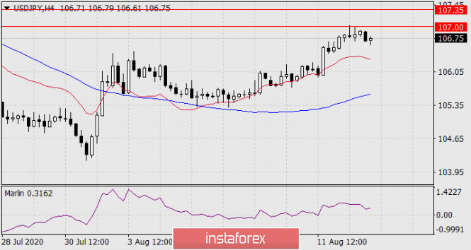На четырёхчасовом масштабе тенденция по всем индикаторам также восходящая. Цена растёт над индикаторными линиями баланса и Крузенштерна, Марлин немного снижается (корректирует), но сохраняется в зоне роста. Ждём завершения коррекции и новую атаку цены на уровень 107.00 с последующим ростом к 107.35.