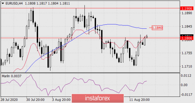 На графике четырёхчасового масштаба промежуточной целью на пути к 1.1906 выступает линия Крузенштерна на отметке 1.1840. Только закрепление цены над этим уровнем позволит цене продолжить рост. Для такого закрепления с последующим ростом нужны сильные фундаментальные факторы. Сегодня их может не быть, а завтра по зоне евро выйдет торговый баланс за июнь и ещё более значимые данные по США – розничные продажи, промышленное производство, потребительское доверие. Очевидно, именно американские данные и определят дальнейшее направление евро.