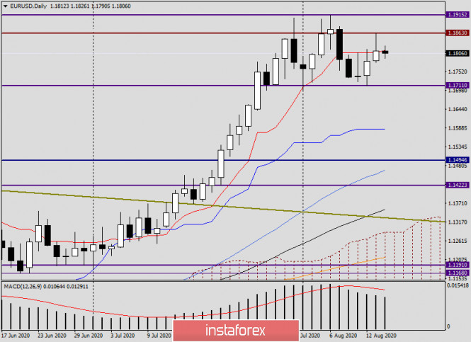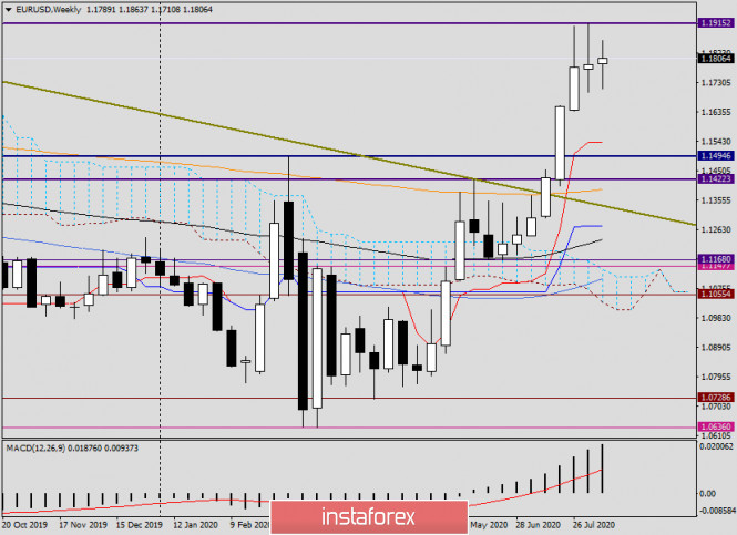 Анализ EUR/USD на 14 августа. Перспективы закрытия неделиИнстаФорекс - Instaforex, 5 лет назад Здравствуйте, уважаемые коллеги! Несмотря на то что вчерашние данные по первичным обращениям за пособием по безработице в США оказались значительно лучше консенсус-прогноза 1 миллион 120 тысяч и по факту составили 963 тысячи, это не уберегло доллар США от очередного витка снижения в паре с единой европейской валютой. Основное внимание участников рынка сосредоточено относительно программы дополнительного стимулирования ведущей мировой экономики, дебаты по которой зашли в тупик. Президент США Дональд Трамп, в привычном ему стиле пригрозил запретить любые денежные средства для удобства почтового голосования. Собственно, финансовая поддержка почтовой службы и модернизация избирательной инфраструктуры и являются главными противоречиями в переговорах Конгресса и администрации Белого дома. Напомню, что программа дополнительных стимулов для американской экономики для исправления ситуации, вызванной COVID-19, не может быть согласованна уже вторую неделю. Таким образом, и без того истощённый и слабый доллар попал под ещё большее давление продаж по широкому спектру рынка. Сегодняшний экономический календарь насыщен достаточно важными событиями, на которые торгующим eur/usd стоит обратить внимание. В 12:00 (мск) еврозона предоставит отчёты по пересмотренным данным по ВВП за второй квартал, а также сальдо торгового баланса, без сезонных поправок и изменение числа занятых за этот же промежуток времени. Впрочем, основной блок сегодняшней макроэкономической статистики начнёт поступать из Соединённых Штатов в 15:30 по московскому времени, когда будут опубликованы розничные продажи. Далее в 16:15 (мск) поступят отчёты по промышленному производству, а в 17:00 (мск) будут представлены товарно-материальные запасы на складах и индекс потребительских настроений от Мичиганского университета. Weekly Вполне возможно, что перечисленные выше события окажут влияние на сегодняшнюю ценовую динамику главной валютной пары и итоги закрытия всей торговой недели. На данный момент рынок до сих пор не может определиться с направлением, и торги проходят вблизи цены открытия недели 1.1790. Поскольку валютная пара евро/доллар рассматривается ежедневно, недельный таймфрейм, как правило, показываю и разбираю по понедельникам, с учётом завершения прошлых недельных торгов. Сегодня решил сделать исключение, так как ситуация довольно-таки интересная и достаточно неординарная. На момент написания у текущей недельной свечи фактически отсутствует тело, а сама свеча (вместе с её тенями) находится внутри предыдущей такой же неопределённой свечной модели, которая всё же больше предполагает нисходящую динамику инструмента. Если текущая свеча сохранит свою нынешнюю форму, оснований рассчитывать на последующую реализацию нисходящего сценария станет ещё больше. В этом случае пара рискует упасть в район 1.1540, где проходит линия Тенкан индикатора Ишимоку. Как уже не раз отмечалось, бычий рынок получит реальные перспективы на своё продолжение только в случае пробоя сильного сопротивления продавцов на 1.1915 и закрепления выше этого уровня. Daily Несмотря на то что торги четверга завершились немного выше дневной линии Тенкан, цена закрытия ниже важного и сильного уровня 1.1800 и длинная верхняя тень вче