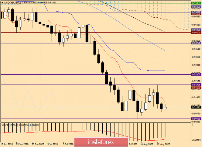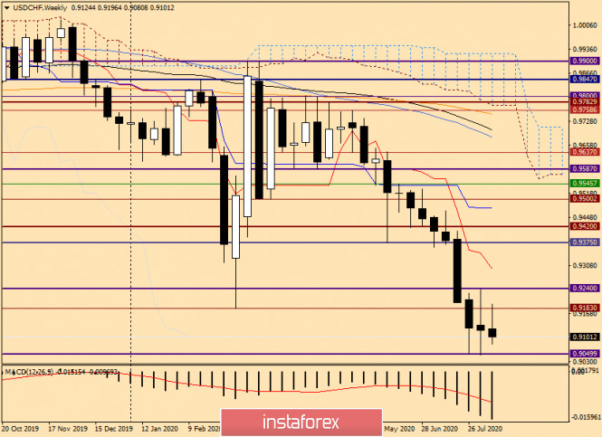 Анализ и прогноз по USD/CHF от 14 августа 2020 годаИнстаФорекс - Instaforex, 5 лет назад Доброго времени суток, уважаемые трейдеры! В сегодняшнем обзоре валютной пары USD/CHF основное внимание будет уделено технической составляющей. Однако для начала о том, что больше всего волнует инвесторов, и о макроэкономической статистике, которая будет опубликована в последний день недельных торгов. Основное внимание трейдеров сфокусировано на обсуждении и принятии дополнительной программы помощи американской экономике, которой значительный урон нанёс COVID-19. Дебаты между Конгрессом США и администрацией Дональда Трампа ведутся уже вторую неделю, однако договориться сторонам пока так и не удаётся. Поскольку ведущая мировая экономика понесла из-за эпидемии коронавируса наиболее существенные потери, ей требуется экстренная помощь о размерах и целевых назначениях которой и ведётся дискуссия. Скорее всего, ситуация по данному вопросу прояснится уже на следующей неделе, а мы обозначим наиболее важные макроэкономические события, которые будут представлены на суд участников рынка в последний торговый день. Большой блок статистики начнёт поступать из Соединённых Штатов начиная с 15:30 по московскому времени. Будут опубликованы данные по розничным продажам, промышленному производству материальным запасам на складах, а также потребительские настроения от Мичиганского университета. Более детально с прогнозами по этим и другим событиям можно ознакомиться, заглянув в экономический календарь. Начнём рассматривать графики цены валютной пары доллар/франк, и для начала обратим свой взор на недельный таймфрейм. Weekly Здесь стоит обратить внимание, что третью неделю подряд USD/CHF торгуется в диапазоне 0.9240-0.9050. Логично предположить, что выход из данного ценового коридора станет определяющим для данной валютной пары, возможно, в среднесрочной перспективе. Текущую неделю доллар/франк завершает снижением, а очередные попытки вернуться выше пробитого уровня поддержки 0.9183 остаются тщетными. Впрочем, после публикации макроэкономической статистики из США текущая ситуация может измениться. Всё будет зависеть от конкретных цифр и реакции на них участников рынка. Если нынешняя недельная свеча, так же как и предыдущая, сформируется в длинными тенями и в пределах обозначенного диапазона, перспектив для последующего роста пары станет больше. Во всяком случае, на мой взгляд, созрела необходимость корректировки курса, но для этого должны появиться соответствующие свечные сигналы. Ждём. Daily Как видим, попытки быков по usd/chf вернуть торги выше важного и сильного уровня 0.9200 потерпели фиаско. Не дойдя несколько пунктов до этой отметки, пара развернулась в южном направлении, и в моменте завершения данной статьи торгуется вблизи ещё одного значимого уровня 0.9100. Стоит отметить, что на 0.9122 находится линия Тенкан индикатора Ишимоку, которая способна оказать активное сопротивление попыткам роста. Если игрокам на повышение удастся закрыть сегодняшние торги выше этой линии, откроется дорога к пробитой поддержке 0.9183 и сильному сопротивлению продавцов, которое проходит на 0.9196. В случае возникновения вблизи этих уровней разворотных моделей свечного анализа на дневном, четырёх часовом и даже на часовом графиках, появится сигнал для открытия по usd/chf коротких позиций. А вот если в це