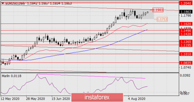 В пятницу евро продолжил развитие в диапазоне неопределённости 1.1712-1.1903. Рост евро продолжится в случае выхода цены над верхнюю границу ценового канала 1.1903, и в этом случае целевым диапазоном станет 1.2040/55. На истории диапазон соответствует минимуму июля 2012 года. Рост цены в указанный диапазон также может означать формирование двойной дивергенции по осциллятору Марлин. То есть даже рост евро на две фигуры не отменит основной сценарий разворота валюты в средне- и долгосрочной перспективе.