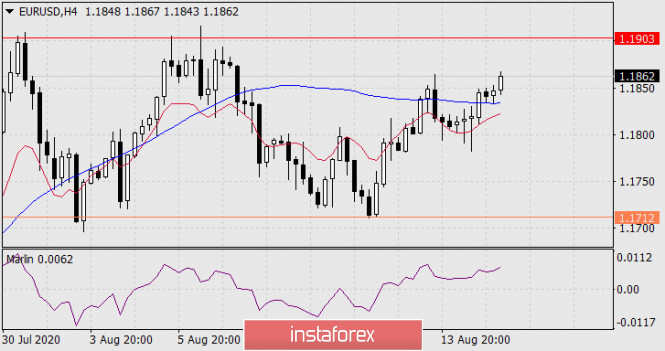 На четырёхчасовом графике цена закрепилась над индикаторной линией Крузенштерна, Марлин также в зоне роста, что в совокупности сохраняет повышенную вероятность роста к 1.1903. Тем не менее, цена, находясь в зоне свободного блуждания, может ещё раз уйти под данную линию, как это было 13-14 августа. Ждём развития событий.