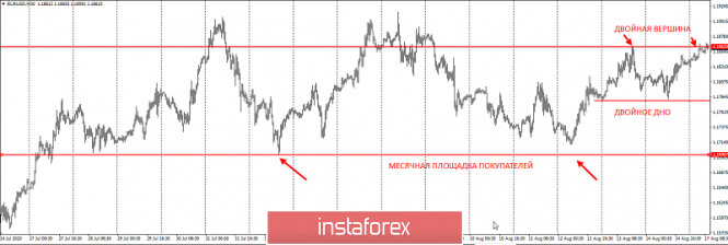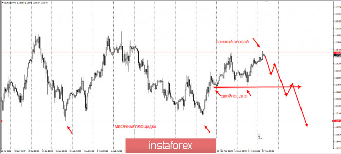 EURUSD – оставляет долгиИнстаФорекс - Instaforex, 5 лет назад Доброе утро, уважаемые трейдеры! Представляю вашему вниманию разбор пары EURUSD. Итак, на прошлой неделе у нас было две торговых идеи на понижение пары к уровню 1,17, но инструмент упорно рос вверх, игнорируя наши предположения. И сегодня утром обновил 1,18600, что говорит об отмене шортового сценария. Но примечательно то, что на пути своего роста инструмент оставил две очень важные для покупателей площадки - двойное дно между 13 и 14 августа, ну и месячный уровень покупателей 1,17: Такие "долги" по самому популярному инструменту среди валютных трейдеров - большая редкость. И рано или поздно рынок их с удовольствием забирает. Забрать их можно либо через ложный пробой, либо после первой шортовой инициативы с отката как показано на скрине ниже.
