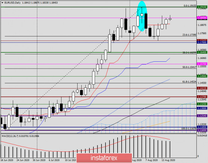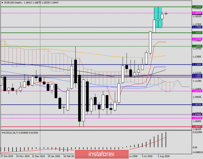 Анализ и прогноз по EUR/USD на 17 августа 2020 годаИнстаФорекс - Instaforex, 5 лет назад Здравствуйте, уважаемые коллеги! Несмотря на то, что на торгах прошлой недели главная валютная пара укрепилась на 0.45%, у евробыков остались нерешёнными некоторые задачи. Главной из них являлся пробой сопротивления продавцов 1.1915, где были показаны максимумы позапрошлой недели, и поглощение медвежьей свечи «Рикша». Немного позже более углублённо рассмотрим некоторые графики валютной пары EUR/USD, а пока о наиболее важных событиях, которые повлияли на ход прошлых недельных торгов и будут находиться в фокусе участников рынка в ходе стартовавшей торговой пятидневки. Как уже упоминалось в предыдущих обзорах по евро/доллару, переговоры между Сенатом и Палатой представителей с одной стороны, и администрацией Белого дома с другой, зашли в тупик. Сторонам никак не удаётся договориться о принятии программы дополнительных стимулов для скорейшего восстановления американской экономики от последствий эпидемии COVID-19. Данный фактор, безусловно, не способствует укреплению доллара США, поскольку инвесторы опасаются, что ведущая мировая экономика будет восстанавливаться более медленными темпами, чем остальные, в частности, экономика еврозоны. Ситуация с коронавирусом не такая сложная, как это было 2-3 месяца назад. Тем не менее, в Соединённых Штатах число суточных заражений, хоть и снизилось, но по-прежнему достаточно велико. В Европе тоже не всё спокойно. В ряде стран вновь вводят ограничительные меры, например в Испании, где в курортных зонах закрываются ночные клубы, а для ресторанов и баров сокращается время работы. Похожая ситуация в Италии, там на 3 недели приостановлена работа всех дискотек и танцплощадок. Во Франции серьёзно ужесточены меры по ношению защитных масок, особенно в таких густонаселённых городах, как Париж и Марсель, которые объявлены зонами повышенного риска. Если затронуть тему макроэкономической статистики, то её влияние на ход торгов носит минимальный характер. Зачастую, макроэкономические показатели и вовсе игнорируется участниками рынка, как это было с пятничными отчётами по розничным продажам в США. На этой неделе важной статистики из Европы и США будет поступать не так уж и много. Тем не менее, хотел бы обратить внимание на индекс потребительских цен еврозоны и протоколы последней встречи Комитета по открытому рынку (FOMC) ФРС США. Оба события запланированы на 19 августа, и более подробно поговорим о них непосредственно в день выхода, то есть уже послезавтра. Weekly Как уже отмечалось в начале статьи, несмотря на рост, крепкое сопротивление продавцов в районе 1.1900-1.1915 даже не было повторно протестировано на пробой. Игроки на повышение попросту не смогли поднять котировку до этих цен. Максимумы были показаны 1.1864, а цена закрытия прошлых торгов составила 1.1841. Тем не менее, считать, что пара eur/usd завершила восходящий тренд и произошёл разворот преждевременно. Торги текущей пятидневки начались с умеренного укрепления единой европейской валюты против доллара США и пара торгуется вблизи сильного технического уровня 1.1850. У игроков на повышение курса главной задачей по-прежнему остаётся пробой уровня 1.1915 и закрытие недели выше этой отметки. Если так и случится, появятся все основания ожидать дальнейшего подъёма к уровням 1.1945, 1.1960, 1.1980 и 1.2000. Медведям