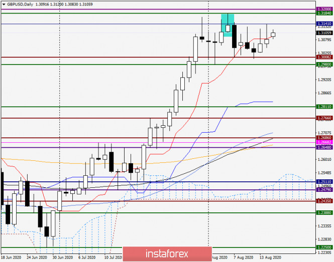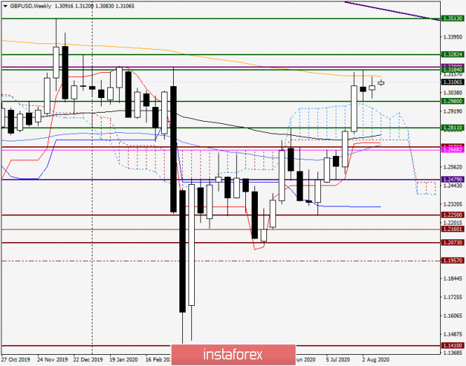 Анализ и прогноз по GBP/USD на 17 августа 2020 годаИнстаФорекс - Instaforex, 5 лет назад Доброго времени суток, уважаемые трейдеры! На прошлой неделе доллар США продемонстрировал по отношению к основным конкурентам смешанную динамику. В частности, фунт стерлингов подрос к «американцу» на 0.28%, однако это пока не даёт оснований с уверенностью смотреть в позитивное будущее британской валюты. Как и по другим долларовым парам, ход торгов по gbp/usd определялся новостями из США о переговорах между Конгрессом и представителями американского президента Трампа по принятия дополнительных стимулов для поддержки ведущей мировой экономики от последствий пандемии COVID-19. Как известно, переговоры зашли в тупик и отменены на неопределённый срок. В эти выходные стало известно и об отмене дальнейших переговоров по торговому урегулированию между США и Китаем. Напомню, что ещё в январе этого года Вашингтон и Пекин заключили «первую фазу» торговой сделки, однако с тех пор дальнейших продвижении в этом направлении мы не увидели. Как вы знаете, на пике пандемии COVID-19 Трамп, фактически, обвинил Китай в распространении заразы и потребовал денежной компенсации. Затем вспыхнул дипломатический скандал, о котором также хорошо известно. Хотелось бы отметить, что с приближением выборов, и без того достаточно экспрессивный не весьма неоднозначный в своих комментариях и решениях 45-й президент США, становится ещё более непредсказуемым политиком. Полагаю, что для переизбрания на второй срок Дональд Трамп сделает всё возможное и ещё не раз удивит или даже шокирует мировую общественность. Что касается экономического календаря и важных событий которые способны повлиять на ценовую динамику валютной пары фунт/доллар, то необходимо отметить публикацию протоколов ФРС, а также данные по изменению потребительских цен в Великобритании. Более подробно об этих и других событиях будет упоминаться в день их выхода, а пока переходим к рассмотрению технической картины по GBP/USD. Weekly Как видим, на пути пары в северном направлении серьёзной преградой является оранжевая 200 экспоненциальная скользящая средняя, которая три недели кряду не пускала цену выше. Полагаю, что только пробой 200 ЕМА и уровня сопротивления 1.3184 позволят рассчитывать на дальнейший рост «британца». Впрочем, не стоит сбрасывать со счетов сильную ценовую зону 1.3200-1.3240, которая может не пустить котировку выше и развернуть её в южном направлении. Тем не менее, очень многое будет зависеть от итогов открывшихся недельных торгов и цены их закрытия. Пробой 200 ЕМА(1.3145), 1.3184 и 1.3200 с закрытием выше, просигнализирует о дальнейшем потенциале роста и более дальних целях, обозначать которые пока рановато будет. Если торги текущей пятидневки завершаться снижение и появлением медвежьей разворотной свечи с ценой закрытия ниже важнейшего психологического и технического уровня 1.3000, впору будет задуматься о смене восходящего сценария на нисходящий, а значит готовиться к продажам. Daily Здесь отчётливо видно, что два предыдущих торговых дня быки по фунту не могли пройти вверх линию Тенкан индикатора Ишимоку. Однако начало сегодняшних торгов вселяет оптимизм, относительно пробоя Тенкан. В моменте завершения обзора пара торгуется выше этой линии, вблизи 1.3107. В случае продолжения восходящей динамики, быкам по британской валюте необходимо 