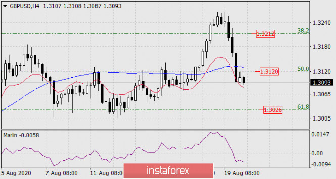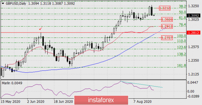 Прогноз по GBP/USD на 20 августа 2020 годаИнстаФорекс - Instaforex, 5 лет назад GBP/USD Ближайшей целью фунта становится уровень Фибоначчи 61,8% на цене 1.3026, где фунт уже находил поддержку в период с 3 по 13 августа. То есть уровень достаточно сильный, и его преодоление отправит цену ко второй цели 1.2912 (76,4% по Фибоначчи). Основная борьба развернётся на линии Крузенштерна дневного масштаба в районе 1.2812, что также является пиком цены от 10 июня. Преодоление данного уровня раскрывает сценарий среднесрочного падения британской валюты.
