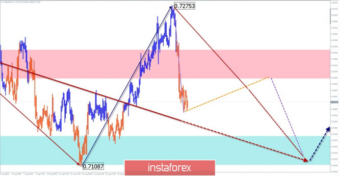 Упрощенный волновой анализ и прогноз AUD/USD и GBP/JPY на 20 августаИнстаФорекс - Instaforex, 5 лет назад AUD/USD Анализ: На графике австралийского доллара с марта текущего года развивается восходящая волна, задающая тренд. Масштаб движения уже превышает уровень дневного тайм-фрейма. Котировки сейчас находятся в районе разворотной зоны, образуя коррекцию. Она имеет форму сдвигающейся плоскости и близится к завершению. Прогноз: Сегодня в первой половине дня ожидается общий нисходящий курс движения, вплоть до полного завершения всей коррекционной волны. Вероятным участком завершения выступает расчетная поддержка. Далее следует ждать разворот и начало ценового роста. Зоны потенциального разворота Сопротивление: - 0.7200/0.7230 Поддержка: - 0.7140/0.7110 Рекомендации: Продажи австралийского доллара сегодня могут быть очень рискованны. Основное внимание рекомендуется уделить поиску сигналов разворота для покупки инструмента. Пояснения: В упрощенном волновом анализе (УВА) волны состоят из 3 частей (А-В-С). Анализируется последняя незавершенная волна. Сплошным фоном стрелок показана сформированная структура, пунктирным - ожидаемые движения. Внимание: Волновой алгоритм не учитывает продолжительность движений инструмента по времени! Материал предоставлен компанией InstaForex - www.instaforex.com |