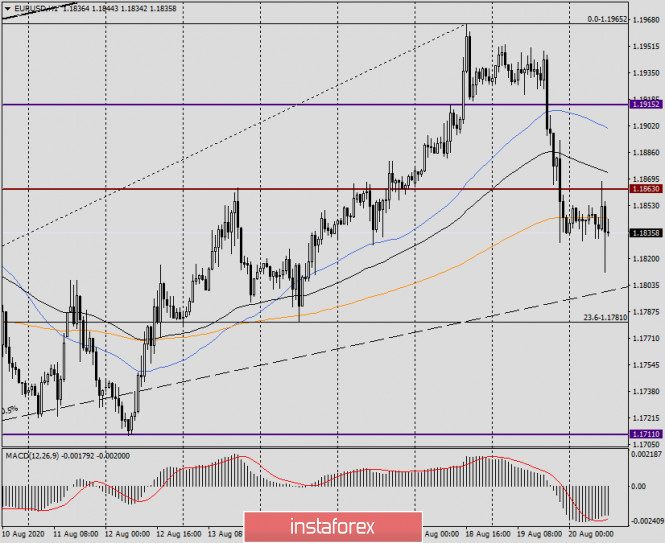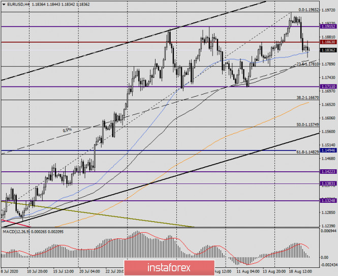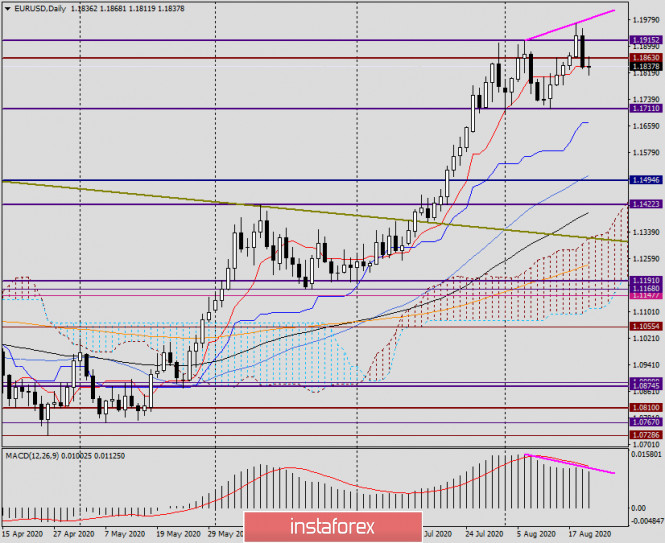Анализ и прогноз по EUR/USD на 20 августа 2020 годаИнстаФорекс - Instaforex, 5 лет назад У евробыков ещё есть время, чтобы исправить ситуацию Здравствуйте, уважаемые коллеги! Главным событием вчерашнего дня и всей недели стала публикация протоколов последней встречи Комитета по открытому рынку (FOMC) ФРС США. Можно было предположить, что основной темой в протоколах станет неопределённость экономического восстановления после пандемии COVID-19. В сущности, именно это и было отражено в документе. Кроме этого, руководители Федеральной Резервной Системы акцентировали своё внимание на низкой инфляции и выразили надежду, что в дальнейшем инфляция будет на более высоких уровнях. При этом дальнейшее снижение процентных ставок не рассматривалось, но нынешние низкие уровни ставок останутся таковыми в течение длительного периода времени, как минимум в течение нескольких ближайших лет. Если подвести итог, то в протоколах последней встречи ФРС не было ничего неожиданного или экстраординарного. Заглянув в сегодняшний экономический календарь, можно выделить отчет ЕЦБ по заседанию, посвященному денежно-кредитной политике, который будет опубликован в 14:30 (мск), а также первичные обращения за пособием по безработице в США, которые будут представлены участникам рынка в 15:30 по московскому времени. Настало время обратить свой взор на графики главной валютной пары рынка Forex. Daily По итогам вчерашних торгов пара значительно снизилась, завершив сессию среды немного ниже красной линии Тенкан индикатора Ишимоку. Кроме этого, пара вернулась под сильный технический уровень 1.1860 и закрыла торги 19 августа на 1.1836. Как видим, сегодня попытки котировки вернуться выше 1.1860 на данный момент успехом не увенчались. Пара встретила сильное сопротивление на 1.1868, после чего развернулась на снижение. Если рынок продолжит выбранное вчера нисходящее движение, то следующими целями медведей по eur/usd станут уровни 1.1800, 1.1780, 1.1750 и 1.1715. Впрочем, пара может получить сильную поддержку в важной и сильной ценовой зоне 1.1820-1.1800. Задачей игроков на повышение представляется не допустить ухода цены под 1.1800 и удержать торги по eur/usd выше этой отметки. Не зря вчерашний день определялся как очень важный и во многом определяющий для американской валюты. Впрочем, делать выводы об окончании восходящего тренда по EUR/USD и его смене на нисходящий, по моему мнению, ещё рано. Однако факт ложного пробоя ключевого сопротивления продавцов в районе 1.1900-1.1915 заставляет об этом задуматься. Учитывая, что протоколы ФРС были отыграны в пользу доллара США, а также наличие на дневном графике медвежьей дивергенции индикатора MACD, больше располагают к дальнейшему снижению евро/доллара. Если же быки по инструменту найдут силы вернуть котировку выше Тенкан и некогда пробитого уровня сопротивления 1.1863 и закрыть сессию выше, можно будет предположить возобновление восходящей динамики. Н4 На этом таймфрейме построил восходящий канал с параметрами: 1.1185-1.1254 (линия поддержки) и 1.1905 (линия сопротивления). На момент завершения данной статьи пара опускается к средней линии канала (пунктирная), прямо над которой проходит 89 экспоненциальная скользящая средняя (чёрная). И пунктирная линия, и 89 ЕМА находятся вблизи важнейшего уровня 1.1800, поэтому покупки отсюда представляют технически вполне обоснованными. Впрочем, прямо здесь и сейчас 