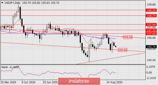 Прогноз по USD/JPY на 21 августа 2020 годаИнстаФорекс - Instaforex, 5 лет назад USD/JPY Поддержкой ценовому откату служит линия ценового канала с текущей отметкой 105.40. Цена может до поддержки не дойти. Целью и сопротивлением цены выступает верхняя вложенная линия ценового канала на отметке 106.65.
