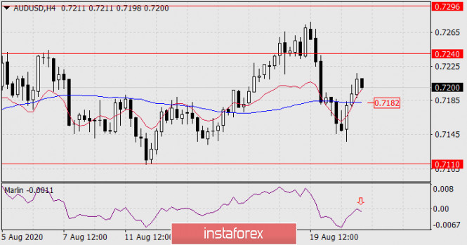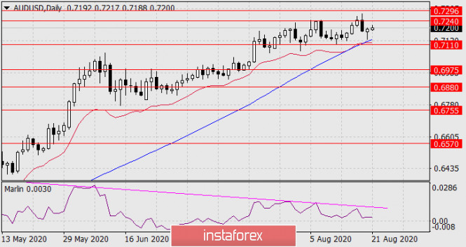 Прогноз по AUD/USD на 21 августа 2020 годаИнстаФорекс - Instaforex, 5 лет назад AUD/USD Диапазон консолидации AUD/USD прежний – 0.7110-0.7240. И так как присутствующие в нашем исследовании индикаторы сохраняют прежние показания, ждём ещё одной попытки цены преодолеть нижнюю границу консолидации 0.7110. Далее ждём снижение пары к целевому уровню 0.6975.