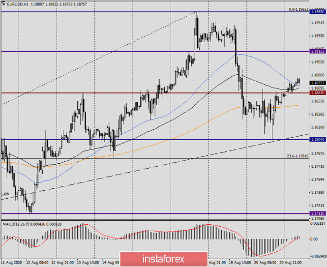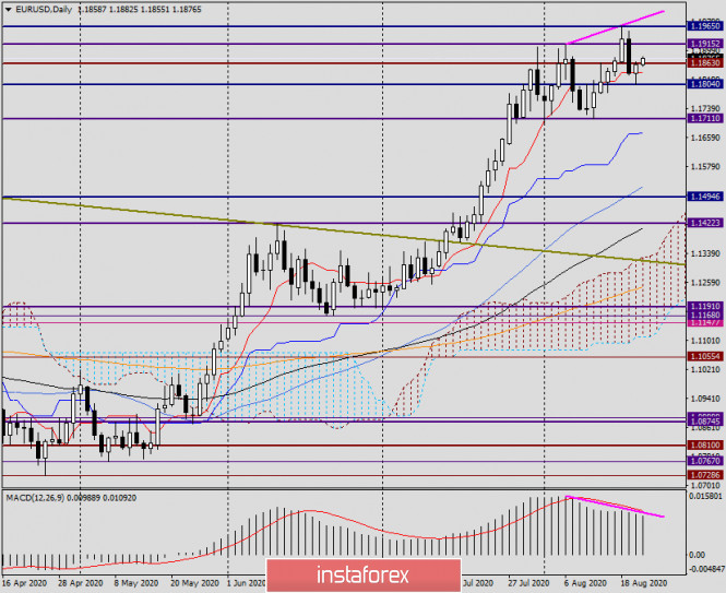 Анализ и прогноз по EUR/USD на 21 августа 2020 годаИнстаФорекс - Instaforex, 5 лет назад А ВОЗ и ныне там Доброго времени суток, уважаемые коллеги! Daily По итогам вчерашних торгов главная валютная пара незначительно укрепилась, закрыв сессию четверга на 1.1859, что весьма символично, учитывая сильный технический уровень 1.1860 и пробитое ранее сопротивление на 1.1863. Символизм в том, что закрыть вчерашние торги выше 1.1860 быкам по евро так и не удалось, не хватило одного пункта. Впрочем, в моменте написания пара продолжает демонстрировать восходящую динамику и торгуется вблизи 1.1876. Пыл долларовых быков, который наблюдался после публикации протоколов ФРС, вчера охладили первичные обращения за пособием по безработице в США, которые вышли хуже прогноза 925 тысяч и выросли до 1 миллиона 106 тысяч заявок. Как ни старается Федеральная Резервная Система поддержать экономику Соединённых Штатов, но последствия COVID 19 не могу пройти бесследно. Хотя и в Европе далеко не всё так благополучно с новым типом коронавирусной инфекции. В ряде европейских стран резко увеличилось суточное число заражений COVID-19 и снова вводятся ограничительные меры. Например, в Германии вчера было зафиксировано 1700 случаев заболевания коронавирусом. На этом фоне весьма нелепо выглядят заявления Всемирной Организации Здравоохранения (ВОЗ) о том, что необходимо проводить раннюю диагностику. В этом залог успеха в борьбе с COVID-19. Это и так понятно даже школьнику. ВОЗ только и делает, что предупреждает и нагоняет жути относительно дальнейшего распространения пандемии. Никаких реальных действий в плане разработки эффективной вакцины против коронавируса или проведения каких-то действительно важных мероприятий по предотвращению распространения COVID-19 от ВОЗ не исходит. Здесь можно согласиться с президентом США Дональдом Трампом, который раскритиковал Всемирную Организацию Здравоохранения за её бездействие и неэффективность и отказался платить взносы. Однако ничего в работе ведомства существенно не изменилось. Как говорится: а ВОЗ и ныне там, в пространных заявлениях и предупреждениях. Если вернуться к технической картине по валютной паре EUR/USD, то быкам по инструменту сегодня необходимо приложить максимум усилий, для того чтобы верхняя тень недельной свечи оказалась как можно короче и не появился разворотный сигнал свечного анализа. Считаю, что недельный таймфрейм самый сильный в плане отработки появляющихся сигналов. Однако вернёмся к дневному графику. Игрокам на повышение курса очень важно закрыть торги выше 1.1900, а ещё лучше, выше ложно пробитого уровня сопротивления 1.1915. Если это у них получится, можно не сомневаться, что ключевой, на данный момент, уровень сопротивления 1.1965 будет ещё раз протестирован на пробой. В пользу евробыков говорит тот факт, что они смогли вернуть котировку выше линии Тенкан индикатора Ишимоку, и теперь её пробой можно признать ложным. Для того чтобы вернуть пару к нисходящей динамике, медведям нужно опускать цену под Тенкан, после чего пробивать сильный и важный уровень 1.1800. Как видим, именно на 1.1804 пара вчера получила сильную поддержку и немного компенсировала понесённые после протоколов ФРС потери. Н1 На часовом графике котировка ещё вчера вернулась выше 200 экспоненциальной скользящей средней, а сегодня, в моменте завершения обзора, пробивает 50 МА (голубая)