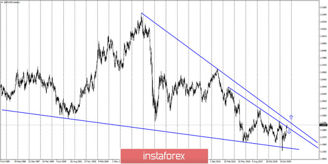 На недельном графике пара фунт-доллар выполнила рост к нижней нисходящей линии тренда. Отбой от этой линии может позволить паре выполнить разворот в пользу доллара США и возобновить процесс падения в направлении приблизительно уровня 1,1500. Это долгосрочная перспектива.