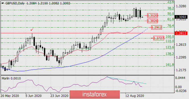 Прогноз по GBP/USD на 24 августа 2020 годаИнстаФорекс - Instaforex, 5 лет назад GBP/USD С преодолением ценой ближайшего уровня 1.3026 ждём дальнейшего снижения к 1.2912 – к уровню Фибоначчи 76,4%, к которой стремится индикаторная линия Крузенштерна.