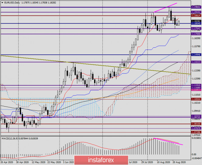 Анализ и прогноз по EUR/USD на 25 августа 2020 годаИнстаФорекс - Instaforex, 5 лет назад Здравствуйте, уважаемые коллеги! Кроме не очень важного индекса экономической активности от ФРБ Чикаго, вчерашний день не содержал в себе больше никакой макроэкономической статистики. Вполне естественно, что торги по главной валютной паре проходили под влиянием технических факторов. К техническому анализу по EUR/USD перейдём немного позднее, а пока о сегодняшних макроэкономических событиях. К моменту написания статьи уже были опубликованы окончательные данные по ВВП Германии за второй квартал, которые оказались сильнее прогнозов. Так, в квартальном исчислении, вопреки прогнозу минус 10.1%, фактический показатель составил минус 9.7%. В годовом выражении немецкий ВВП, прогнозы по которому сводились к минус 11.7%, оказался на значении минус 11.3%. Естественно, что отрицательные значениям по столь важному экономическому показателю стали следствием пандемии COVID-19, которая нанесла удар не только по немецкой экономике. Сегодня же в 11:00 (мск) по Германии будут опубликованы индексы текущих условий, делового климата и ожиданий от IFO. Если и эти отчёты окажутся лучше ожиданий экономистов, можно сделать осторожный вывод о постепенном восстановлении главной европейской экономики. Начиная с 16:00 (мск) из США начнёт поступать статистика по рынку жилья, однако наиболее значимым и важным станет индикатор уверенности потребителей, который будет опубликован в 17:00 по московскому времени. Daily На дневном графике, вполне ожидаемо, были предприняты попытки пробиться выше красной линии Тенкан индикатора Ишимоку. Именно такое предположение было сделано накануне, и рекомендовалось рассматривать открытие продаж после подъёма к линии Тенкан. Впрочем, как хорошо видно на графике, евробыки не сдаются, и сегодня в моменте написания вновь двигают котировку вверх. Техническая зона 1.1850-1.1860 не раз отмечалась как очень сильная и важная для участников рынка, поэтому то, что вчерашние максимумы были показаны на 1.1850, а линия Тенкан сегодня проходит на 1.1860, весьма символично. Для того чтобы вернуть паре восходящую направленность, задачей минимум будет пройти вверх линию Тенкан и закрыть торги выше 1.1860. Если осуществить это получится, следующими целями станут 1.1882, 1.1915 и 1.1965. При этом только истинный пробой последней отметки чётко обозначит дальнейшую готовность и желание пары двигаться в северном направлении. Н4 На этом таймфрейме евро/доллар продолжает торговаться в восходящем канале, причём в данный момент наблюдаются попытки вернуться выше средней линии канала, которая нередко выступает в качестве достаточно сильной поддержки или сопротивления. В текущей ситуации средняя линия канала является сопротивлением, но и её прохождение вверх может оказаться ложным, если не будет пробита 50 простая скользящая средняя, расположенная на 1.1848. Покупки на данном этапе времени считаю запоздавшими, а вот если в ценовой зоне 1.1845-1.1855 на 4-часовом или часовом графиках начнут появляться свечные сигналы на снижение, стоит присмотреться к продажам пары. Открытие коротких позиций по более выгодным ценам выглядит технически обосновано из района цен 1.1880-1.1915, но перед открытием сделок также лучше увидеть подтверждающие сигналы японских свечей. Успешных торгов! Материал предоставлен компанией InstaForex - www.instaforex.com 