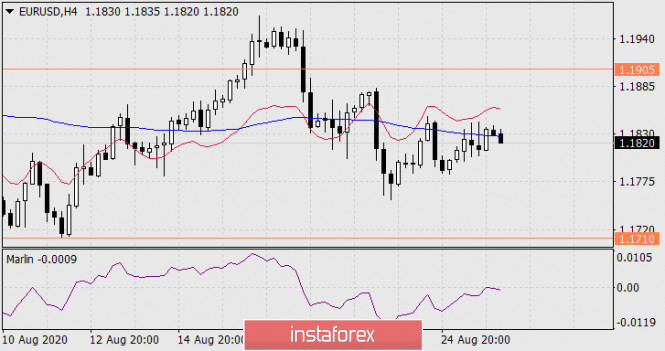 Вчерашние американские экономические данные не сильно помогли рынкам; продажи новых домов за июль возросли до 901 тыс. с 791 тыс. месяцем ранее, деловая активность в производственном секторе Ричмонда за текущий месяц увеличилась с 10 до 18 пунктов, но Dow Jones потерял -0,21%, S&P500 прибавил 0,36%, на что повлияла негативная ситуация сырьевого сектора. При этом индекс потребительского доверия в США от Conference Board за август снизился с 91,7 до 84,8. Евро, ещё днём приободрённый ростом настроений в деловых кругах Германии Ifo с 90,4 до 92,6, закрыл день ростом на 47 пунктов, что и с технической стороны было сделать не сложно, так как он находится в зоне свободного блуждания 1.1710-1.1905. На графике дневного масштаба сигнальная линия осциллятора Марлин находится на нулевой линии-границе, то есть ситуация нейтральная.