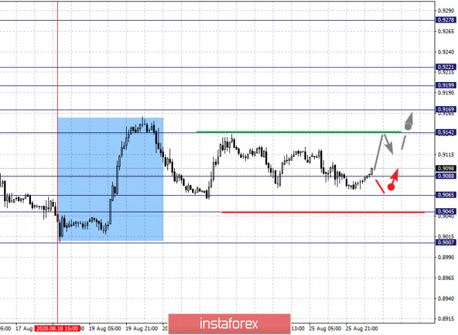 Фрактальный анализ по основным валютным парам на 26 августаИнстаФорекс - Instaforex, 5 лет назад Здравствуйте, уважаемые коллеги. По паре Евро/Доллар продолжение движения книзу возможно после пробоя 1.1775, уровень 1.1884 ключевая поддержка. По паре Фунт/Доллар продолжения развития нисходящей структуры от 21 августа ожидаем после пробоя 1.3052, уровень 1.3182 ключевая поддержка. По паре Доллар/Франк развития восходящей структуры от 18 августа ожидаем после пробоя 0.9142, уровень 0.9045 ключевая поддержка. По паре Доллар/Иена продолжения движения кверху ожидаем после пробоя 106.58, уровень 106.07 ключевая поддержка. По паре Евро/Иена продолжения движения кверху ожидаем после пробоя 125.98, уровень 125.34 ключевая поддержка. По паре Фунт/Иена цена формирует выраженные начальные условия для верха от 24 августа, уровень 138.91 ключевая поддержка. Прогноз на 26 августа: Аналитический обзор валютных пар в масштабе Н1: По паре Евро/Доллар ключевыми уровнями в масштабе Н1 являются: 1.1884, 1.1846, 1.1824, 1.1775, 1.1749, 1.1729, 1.1695 и 1.1641. Здесь мы следим за развитием нисходящего цикла. От 18 августа. Краткосрочное нисходящее движение ожидаем в коридоре 1.1775 – 1.1749, проход ценой шумового диапазона 1.1749 – 1.1729 должен сопровождаться выраженным нисходящим движением к уровню 1.1695, возле которого возможна консолидация. Потенциальным значением для низа считаем уровень 1.1641, по достижении этого уровня ожидаем откат кверху. Краткосрочное восходящее движение возможно в коридоре 1.1824 – 1.1846, пробой последнего значения приведет к углубленной коррекции, здесь цель – 1.1884, этот уровень является ключевой поддержкой для нисходящей структуры от 18 августа. Основная тенденция – формирование нисходящей структуры от 18 августа Торговые рекомендации: Buy: 1.1824 Take profit: 1.1844 Buy: 1.1848 Take profit: 1.1884 Sell: 1.1775 Take profit: 1.1749 Sell: 1.1729 Take profit: 1.1695 По паре Фунт/Доллар ключевыми уровнями в масштабе Н1 являются: 1.3255, 1.3182, 1.3140, 1.3052, 1.2992, 1.2922 и 1.2873. Здесь мы следим за локальной нисходящей структурой от 21 августа. Продолжения движения книзу ожидаем после пробоя 1.3052, в данном случае цель – 1.2992, возле этого уровня консолидация. Пробой 1.2992 приведет к выраженному нисходящему движению, здесь цель – 1.2922. Потенциальным значением для низа считаем уровень 1.2873, по достижении которого ожидаем консолидацию, а также откат кверху. Краткосрочное восходящее движение возможно в диапазоне 1.3140 – 1.3182, пробой последнего значения приведет к формированию восходящего потенциала, здесь цель – 1.3255. Основная тенденция – локальная нисходящая структура от 21 августа, стадия коррекции Торговые рекомендации: Buy: 1.3142 Take profit: 1.3180 Buy: 1.3184 Take profit: 1.3250 Sell: 1.3052 Take profit: 1.2994 Sell: 1.2990 Take profit: 1.2924 По паре Доллар/Франк ключевыми уровнями в масштабе Н1 являются: 0.9278, 0.9221, 0.9199, 0.9169, 0.9142, 0.9088, 0.9065 и 0.9045. Здесь мы следим за формированием восходящей структуры от 18 августа. Краткосрочное восходящее движение ожидаем в коридоре 0.9142 – 0.9169, пробой последнего значения приведет к движению до уровня 0.9199, в коридоре 0.9199 – 0.9221 краткосрочное восходящее движение, а также консолидация. Потенциальным значением для верха считаем уровень 0.9278, по достижении этого уровня ожидаем откат книзу. Краткосрочное нисходящее движение возможно в коридоре 0.9088 – 0.9065, уровень 0.9045 является ключевой поддержкой для верха, его проход ценой будет располагать к развитию нисходящей тенденции, в данном случае потенциальная цель – 0.9007. Основ