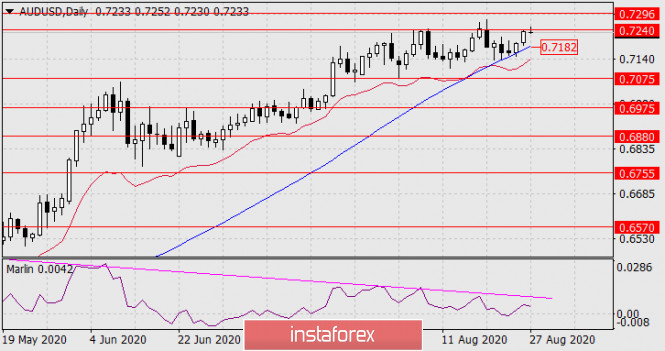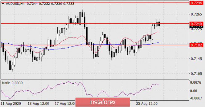 Прогноз по AUD/USD на 27 августа 2020 годаИнстаФорекс - Instaforex, 5 лет назад AUD/USD С уходом цены под индикаторную линию Крузенштерна (0.7182) и с закреплением под ней цена начнёт своё среднесрочное понижение. Первая цель сохраняется на уровне 0.6975. Но так как цена за последние пять суток уже значительно от неё отдалилась, активируется промежуточная цель 0.7075.