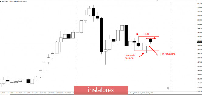 Золото – ловушка для продавцовИнстаФорекс - Instaforex, 5 лет назад Добрый день, уважаемые трейдеры! Представляю вашему вниманию анализ золота. Итак, вчера на фоне очередного обострения отношений между США и Китаем золото подскочило в цене, закрыв день мощным дневным поглощением: Тем самым зажав продавцов за уровнем 1962. Предлагаю поработать на повышение по следующей схеме в рамках структуры АВС. Фиксация прибыли – на пробое котировки 1962. Лонги будут актуальны до пробоя минимума вчерашнего дня.