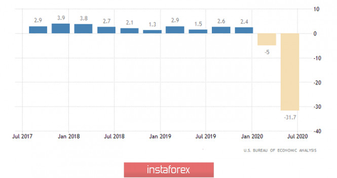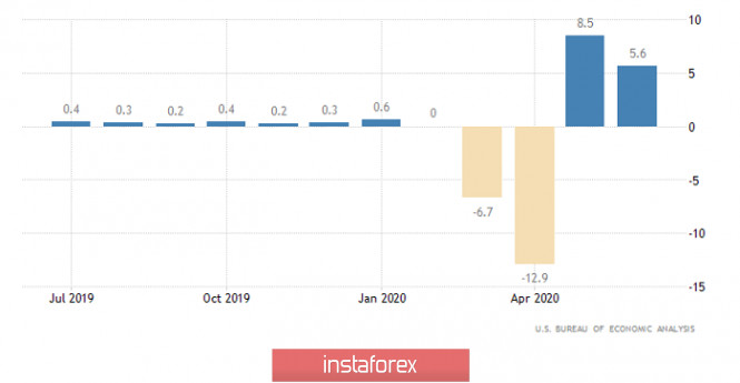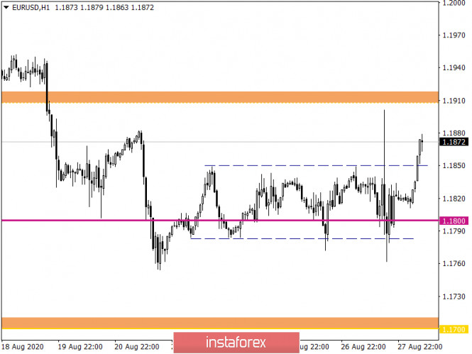 Горящий прогноз по EUR/USD на 28.08.2020 и торговая рекомендацияИнстаФорекс - Instaforex, 5 лет назад Откровенно говоря, Джером Пауэлл сильно разочаровал участников рынков, хотя полноценная реакция на его слова последовала спустя некоторое время, после его выступления. По сути дела, глава Федеральной Резервной Системы ничего не сказал. Мы услышали лишь обещания того, что Федеральная Резервная Система будет проводить более гибкую политику, лучше соответствующую текущей ситуации. Единственное, что действительно конкретно было озвучено, так это то, что если инфляция поднимется выше целевого уровня в 2,0%, то Федеральная Резервная Система будет действовать незамедлительно и сразу же поднимет ставку рефинансирования. Из всего этого участники рынка сделали вывод, что пока инфляция будет ниже 2,0%, то ставка рефинансирования останется на текущем уровне. Хотя Джером Пауэлл этого и не говорил. Более того, из его обтекаемых формулировок следовало, что Федеральная Резервная Система вполне может повысить ставку рефинансирования. Но никакой определенности нет. И на фоне того как днем ранее Европейский Центральный Банк по сути дела объявил о постепенном начале ужесточения монетарной политики, чего-то подобного ожидали и от Джерома Пауэлла. Так что выступление главы Федеральной Резервной Систем, действительно разочаровало инвесторов. При этом у доллара были все основания для уверенного роста. Но на макроэкономическую статистику вчера вообще никто не смотрел. А ведь вторая оценка ВВП за второй квартал оказалась намного лучше прогнозов, так как оказывается, что темпы экономического спада ускорились с -5,0% не до -32,9%, а всего-навсего до -31,7%. Кроме этого, рынок труда продолжает восстанавливаться, несмотря на то что все уже ждали чуть ли не остановки этого процесса. Так, число первичных заявок на пособия по безработице сократилось с 1 104 тыс. до 1 006 тыс. Что, правда, оказалось немного хуже прогноза в 1 004 тыс. Но гораздо важнее то, что количество повторных заявок на пособия по безработице уменьшилось с 14 758 тыс. до 14 535 тыс. А ведь ожидался и вовсе рост до 14 900 тыс. Так что макроэкономическая статистика в Соединенных Штатах, откровенно говоря, была довольно неплохой. Темпы роста ВВП (Соединенные Штаты): Если вчера макроэкономическая статистика никого не интересовала, то сегодня ее практически нет. Единственное, что публикуется, так это личные доходы и расходы американцев. При этом если доходы должны сократиться на 0,4%, то расходы могут вырасти на 1,2%. Нужно отметить, что и без того уже два месяца подряд доходы снижаются, а расходы только растут. И это крайне неприятная ситуация. Падение доходов, конечно, является следствием рекордно высокой безработицы. Но вот рост расходов в этой ситуации вызывает беспокойство, так как рано или поздно, если рынок труда не восстановится, совокупное потребление резко сократится и тем самым лишь еще больше усугубит и без того тяжелую экономическую ситуацию. Личные расходы (Соединенные Штаты): Валютная пара евро/доллар в период минувшего дня проявила сверхвысокую активность, вследствие чего ценовой диапазон 1,1785/1,1850 был локально пробит восходящем направлении. Рост волатильности обусловлен двумя факторами: продолжительный застой в границах 1,1785/1,1850; информационно-новостной фон описанный выше. Рассматривая торговый график в общем пла