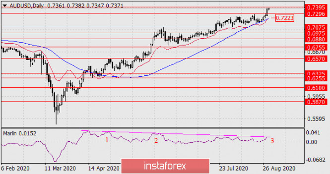 На четырёхчасовом графике цена показывает только первое намерение ожидаемого разворота, нужно дождаться более внятного снижения прежде всего осциллятора Марлин. Окончательным сигналом в среднесрочное понижение станет уход цены под линию Крузенштерна на дневном масштабе (0.7223). Предварительным сигналом станет снижение цены под промежуточный целевой уровень 0.7296.