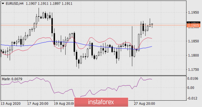 На графике дневного масштаба цена отработала верхнюю границу диапазона свободного блуждания 1.1710-1.1905, берущего начало 31 июля (этот факт нахождения цены в рамках диапазона также может быть причиной того, что стратегические инвесторы не оказывали сильного сопротивления покупателям). Выход цены чуть выше максимума 18 августа по осциллятору Марлин сформирует уже двойную дивергенцию, а это для евро сильный разворотный паттерн. Также евро может продолжить рост в диапазон 1.2040/55. В этом случае дивергенция переформируется в обычную (штриховая линия на дневном графике).
