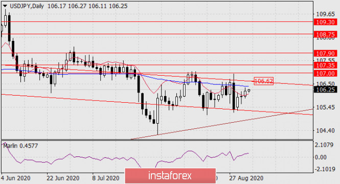 Прогноз по USD/JPY на 3 сентября 2020 годаИнстаФорекс - Instaforex, 5 лет назад USD/JPY На дневном графике это закрепление состоялось над линией баланса. Теперь ближайшей целью рынка становится линия ценового канала на отметке 106.62. Выход цены над неё продлит рост к уровню 107.00.