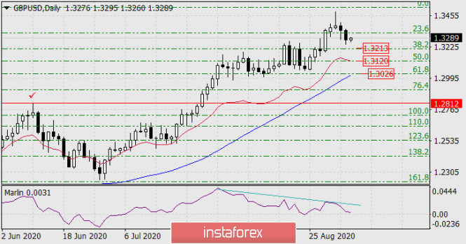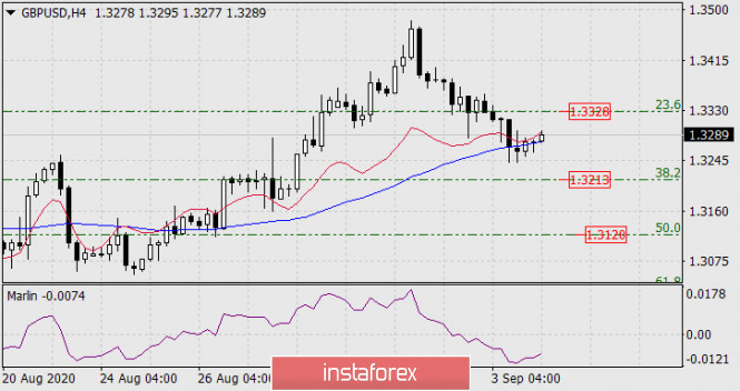 Прогноз по GBP/USD на 4 сентября 2020 годаИнстаФорекс - Instaforex, 5 лет назад GBP/USD После завершения коррекции ждём дальнейшего снижения к целям 1.3213 и 1.3120, заданных уровнями Фибоначчи 38,2% и 50,0%. Данная сетка видна на графиках daily и Н4. Давление на цену оказывает дивергенция по осциллятору Марлин.