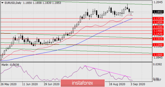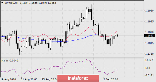 На графике дневного масштаба вчерашнее снижение было остановлено индикаторной линией баланса – рынок пока не решился на явную смену тренда, но сегодня такая возможность есть. Осциллятор Марлин закрепился в зоне отрицательных значений.
