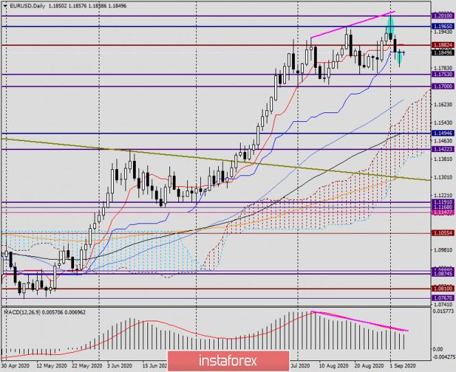 Анализ и прогноз по EUR/USD на 4 сентября 2020 годаИнстаФорекс - Instaforex, 5 лет назад Разворачиваются как хотят и когда хотят! Здравствуйте, уважаемые коллеги! Как обычно, одни инвестиционные дома отмечают возможности нисходящего сценария главной валютной пары рынка Forex, другие, наоборот, пророчат дальний рост EUR/USD. Важно, что и в одном и другом случае для реализации того или иного сценария должны обязательно присутствовать необходимые технические и (или) фундаментальные факторы. Поскольку автор больше склонен воспринимать факторы технического характера, о них в основном сегодня и будет речь. Однако как обойти вниманием главное событие сегодняшнего дня и всей недели - данные по рынку труда США за август? Этого сделать нельзя. Итак, по консенсус-прогнозу экспертов, уровень безработицы в Соединённых Штатах опустится с предыдущих 10.2% до 9.8%. Учитывая, что ситуация с COVID-19 в Америке одна из самых сложных в мире, такой прогноз по безработице можно считать весьма и весьма оптимистичным. Далее, изменение числа занятых в частном несельскохозяйственном секторе американской экономики ожидается в пределах 1200, в то время как предыдущий показатель был на значении 1462. Здесь ожидания как бы более реалистичные. И наконец, рост средней почасовой оплаты труда экономисты оценивают в 0% по сравнению с июльским ростом на 0.2%. В общем и целом, по моему личному мнению, ожидания весьма осмысленные, если не считать снижения безработицы ниже уровня 10%. Хотя, с другой стороны, отмена карантинных ограничений и возобновление работы практически всех предприятий предполагает масштабный найм на работу. Посмотрим, какие фактические цифры мы увидим, ждать осталось недолго. Напомню, что сегодня в 15:30 по московскому времени выйдут американские трудовые отчёты, которые являются одними из самых важных макроэкономических показателей. Между прочим отмечу, что вчерашние первичные обращения за пособием по безработице в США вышли лучше ожиданий 950 тысяч и по факту составили 881 тысячу. Daily Настало время перейти к технической картине по главной валютной паре, и начнём с дневного графика. Первое, что бросается в глаза, это частое появление разворотных свечей, в нашем случае через день. То есть, разворачиваются как хотя и когда хотят, внося тем самым смуту в ряды трейдеров. То появляются сигналы, что доллар США продолжит слабеть, потом возникает сигнал противоположного значения. И вот вчера рынок в очередной раз расписался в своём неведении, куда держать курс. Свеча за 3 сентября с очень длинной нижней тенью (или хвостом) ясно дала понять, что снижаться пара не спешит. Получается, будет расти? Как предполагалось ещё в начале текущей недели, многое, если не всё, решится в последний день торгов, когда будут опубликованы трудовые отчёты из Соединённых Штатов. Давайте ка немного порассуждаем о будущем евро/доллара и вспомним некоторые ключевые уровни. Итак, вверху это 1.2092, где были показаны максимальные значения трёхлетней давности. Выше проходит важный и сильный уровень 1.2555, где были зафиксированы максимумы февраля 2018 года. Хотел бы отметить, что от обеих отметок пара сильно падала, что лишний раз подтверждает их значимость и силу. Исторический и технический уровень внизу - это 1.1750 (или 1.1747, если хотите), ну и отметка 1.1700. Если eur/usd закрепится под 17-ой фигурой, откроется дорога к 1.1600 и 1.1500. Чт