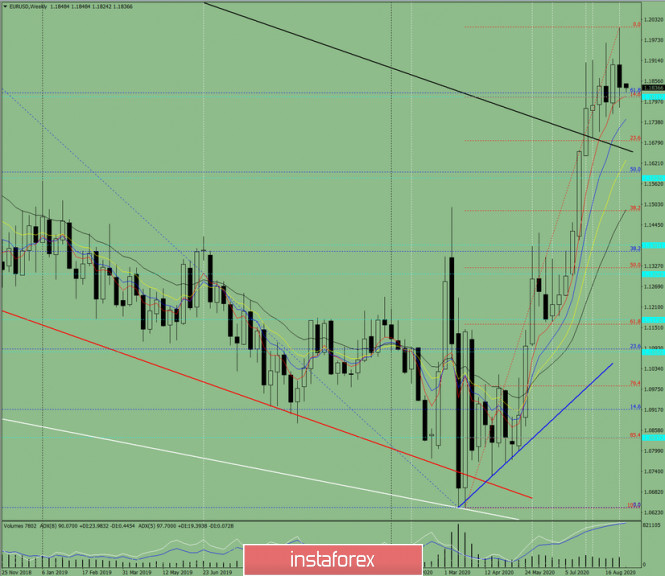 Технический анализ на неделю с 7 по 12 сентября по валютной паре EUR/USDИнстаФорекс - Instaforex, 5 лет назад Пара на последней неделе, двигаясь вверх, протестировала верхний фрактал - 1.1965 (недельная свеча от 16.08.2020), и после этого цена ушла вниз. Двигаясь после этого вниз, цена протестировала откатный уровень 14.6% - 1.1810 (красная пунктирная линия). Рынок на предстоящей неделе может продолжить движение вниз. Трендовый анализ. На этой неделе цена от уровня 1.1837 (закрытие последней недельной свечи) может продолжить движение вниз, с целью 1.1685 - откатный уровень 23.6% (красная пунктирная линия). При тестирования этого уровня, возможно, работа вверх с целью 1.2010 - верхний фрактал (красная пунктирная линия). Рис. 1 (недельный график). Комплексный анализ: - индикаторный анализ – вниз; - уровни Фибоначчи – вниз; - объёмы – вверх; - свечной анализ – вниз; - трендовый анализ – вверх; - линии Боллинджера – вниз; - месячный график – вниз. Вывод по комплексному анализу - нисходящее движение. Общий итог расчёта свечи валютной пары EUR/USD по недельному графику: цена на неделе, вероятно, будет иметь нисходящую тенденцию, с отсутствием верхней тени у недельной чёрной свечи (понедельник – вниз) и отсутствием нижней тени (пятница - вниз). Первая нижняя цель 1.1685 - откатный уровень 23.6% (красная пунктирная линия). При тестирования этого уровня, возможно работа вверх с целью 1.2010 - верхний фрактал (красная пунктирная линия). Маловероятный сценарий: при движении вниз и достижения откатного уровня 14.6% - 1.1810 (красная пунктирная линия) цена может продолжить работу вниз, с целью 1.1659 - линия поддержки (чёрная жирная линия). Материал предоставлен компанией InstaForex - www.instaforex.com |