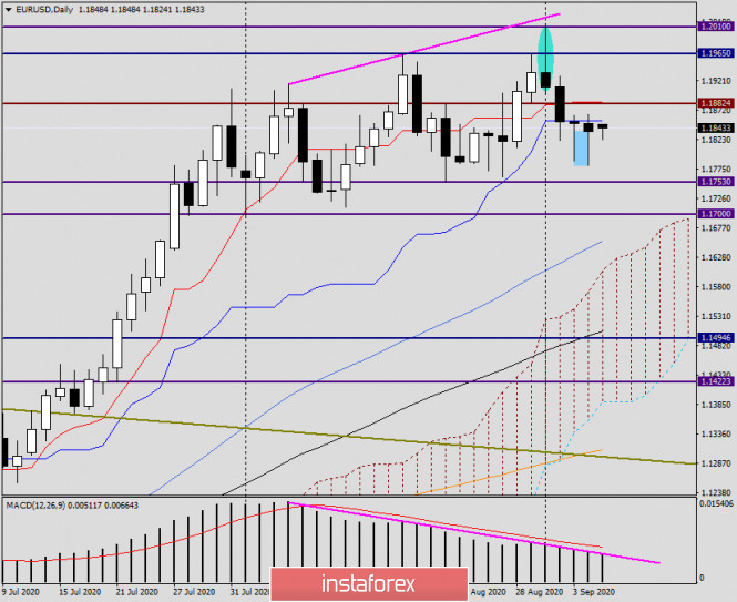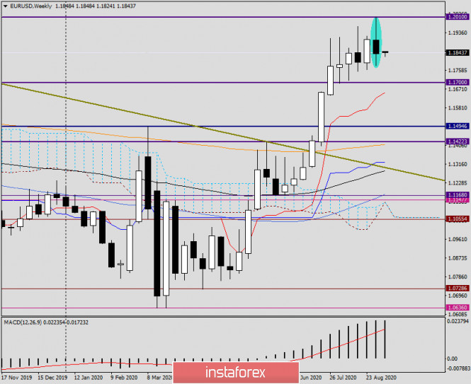 Анализ и прогноз по EUR/USD на 7 сентября 2020 годаИнстаФорекс - Instaforex, 5 лет назад Здравствуйте, уважаемые коллеги! Итак, главным событием прошлой недели были данные по рынку труда США, которые дают инвесторам понять какими темпами идёт восстановление крупнейшей мировой экономики от COVID-19, и идёт ли оно вообще. Как сообщило в пятницу Министерство труда Соединённых Штатов Америки, в августе количество новых рабочих мест в несельскохозяйственного сектора американской экономики составило 1 миллион 371 тысячу, что ниже прогнозов, которые сводились к 1 миллиону 400 тысячам. А вот уровень безработицы довольно-таки неожиданно снизился аж до 8.4%, в то время, как ожидалось, что он составит 9.8%. Впрочем, как уже отмечалось такое снижение безработицы в Штатах можно объяснить снятием ограничений, вызванных пандемией коронавируса и активному найму новых работников, или же возвращением из отпусков работавших до этого сотрудников. Что касается средней почасовой оплате труда, то её рост составил 0.4%. Это достаточно неплохой показатель(прогноз 0.0%), и его также можно отнести к более активному восстановлению рынка труда США. По моему мнению, данные по трудовым отчётам, в целом, вышли достаточно неплохими. Тем не менее, прямо здесь и сейчас, делать окончательные выводы рано. Да, суточный прирост заражений COVID-19 в США пошёл на убыль, но очаги эпидемии ещё остаются, также, как и бесконечные разговоры о второй, третьей или какой -то там ещё волне пандемии COVID-19. Прежде чем перейти к рассмотрению технической картины по главной валютной пары рынка Forex, выделю два события, которые на этой неделе, по моему мнению, можно считать самыми важными. В четверг, 10 сентября, Европейский Центральный Банк(ЕЦБ) озвучит своё решение по процентным ставкам, после чего пройдёт пресс-конференция президента ЕЦБ Кристин Лагард. Многие эксперты полагают, что Лагард может намекнуть о новых стимулирующих мерах, для восстановления экономики еврозоны от COVID-19. На следующий день США опубликуют данные по индексу потребительских цен. Напомню, что это важнейший инфляционный показатель, который в свете новой денежно-кредитной политики ФРС будет иметь особенно важное значение. На неделе предстоит публикация ещё немалого количества разнообразной макроэкономической статистики, но о ней будем вспоминать непосредственно в день публикации. Что касается дня сегодняшнего, то его, судя по крайне малому количеству макроэкономических отчётов, можно смело считать типичным понедельником, когда рынок раскачивается. Weekly По итогам прошлых недельных торгов валютная пара евро/доллар снизилась на 0.5%. Как и предполагалось ранее, пара не смогла с первой попытки преодолеть очень важный и сильный психологический уровень 1.2000, в результате чего от 1.2010 произошёл отскок и торги прошлой пятидневки закрылись на 1.1837. Здесь необходимо заметить, что и отметка 1.1900 достаточно сильна и важна. В течении многолетних наблюдений, не раз приходилось видеть, что именно 1.1900, а вовсе не 1.2000, разворачивал цену или оказывал на неё существенное влияние. Это к тому, что быкам по евро не удалось завершить недельные торги не только выше 1.2000, но и закрепиться над 1.1900. Полагаю, что это может стать серьёзной проблемой для перспектив дальнейшего роста. На данный момент, судя по последней недельной свече и той цене от которой стала расти её дли