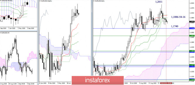 EUR/USD и GBP/USD 8 сентября – рекомендации технического анализаИнстаФорекс - Instaforex, 5 лет назад EUR/USD За прошедшие сутки ситуация не претерпела существенных изменений. Пара остаётся в зоне притяжения дневного золотого креста Ишимоку (1,1886-54-16). Ближайшим медвежьим ориентиром сейчас служит нижняя граница месячного облака 1,1740. Выход из облака откроет перед игроками на понижение новые перспективы и горизонты. Если поддержки дневного креста сейчас сумеют удержать позиции и сохранить преимущество на стороне игроков на повышение, то основной задачей для дальнейшего усиления бычьих настроений будет являться восстановление восходящего тренда (максимальный экстремум 1,2011). Игроки на понижение не сумели обновить минимум прошлой недели и восстановить тренд на Н1. Пара продолжает работать в зоне влияния центрального Пивот-уровня, сегодня он расположен на 1,1825. Другой ключевой уровень младших таймов находится сейчас в районе 1,1854 (недельная долгосрочная тенденция). Закрепление выше текущей зоны сопротивлений (1,1825-54) и разворот мувинга поспособствует переходу преимуществ на сторону игроков на повышение, но для получения надёжного результата на более старших временных интервалах нужно будет восстановить дневной восходящий тренд (1,2011). Работа ниже ключевых уровней Н1 (1,1825-54) сохраняет возможности для дальнейшего усиления медвежьих настроений. Понижательными ориентирами внутри дня сегодня являются классические Пивот-уровни 1,1788 и 1,1763. GBP/USD Игроки на понижение продолжают коррекционное снижение. Им удалось закрыть прошлые сутки ниже исторического рубежа 1,32 и заключительного уровня дневного креста (1,3171). В результате 1,32 и уровни золотого креста Ишимоку (1,3171 – 1,3231 – 1,3304) сейчас выступают в роли сопротивлений. В случае дальнейшего усиления медвежьих настроений следующими ориентирами для снижения в сложившейся ситуации выступают недельный Тенкан (1,2980) и дневное облако. На младших таймах преимущество принадлежит медведям, все анализируемые технические инструменты активно поддерживают развивающийся нисходящий тренд. Понижательными ориентирами сегодня являются поддержки классических Пивот-уровней 1,3112 – 1,3059 – 1,2980. Ключевые сопротивления младших временных интервалов расположены в настоящий момент на 1,3191 (центральный Пивот-уровень дня) и 1,3282 (недельная долгосрочная тенденция), промежуточный уровень 1,3244 (R1). Ichimoku Kinko Hyo (9.26.52), Pivot Points (классические), Moving Avarage (120) Материал предоставлен компанией InstaForex - www.instaforex.com |