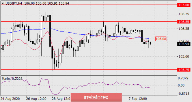 На четырёхчасовом графике цена также закрепилась под индикаторными линиями баланса и Крузенштерна, осциллятор Марлин в зоне понижающейся тенденции. Путь вниз открыт, но неопределённость с текущей ситуацией на фондовом рынке создаёт нестабильность и в сегменте японской йены. Возможен сценарий, при котором падении сменится ростом в районе минимума 1 сентября – 105.60. Также закрепление цены над линией Крузенштерна, выше 106.08, повышает вероятность возврата цены к росту до прежней цели 106.55. Текущая ситуация по паре не торговая.