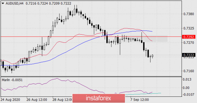 На четырёхчасовом графике цена с осциллятором уже формирует конвергенцию. Это признак коррекции. В случае замедления снижения сырьевых рынков, или даже их коррекционному росту (вчера нефть упала на 5,73% по WTI, до 36,83$), возможен и коррекционный рост австралийского доллара в диапазон накопления 4-7 сентября, что также соответствует сопротивлению линии Крузенштерна на дневном таймфрейме. Данная цель может быть не достигнута и коррекция примет вид ещё одной узкой консолидации. Но в любом случае ждём цену на указанной цели 0.7110 в ближайшие дни.
