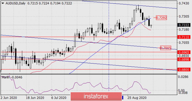 Во вторник, под сильным давлением смежных рынков, австралийский доллар потерял 60 пунктов. Произошло закрепление цены под индикаторной линией Крузенштерна на графике дневного масштаба. Открыта цель 0.7110 (минимум 12 августа), затем может продолжиться снижение к вложенной линии ценового канала в район 0.7005.