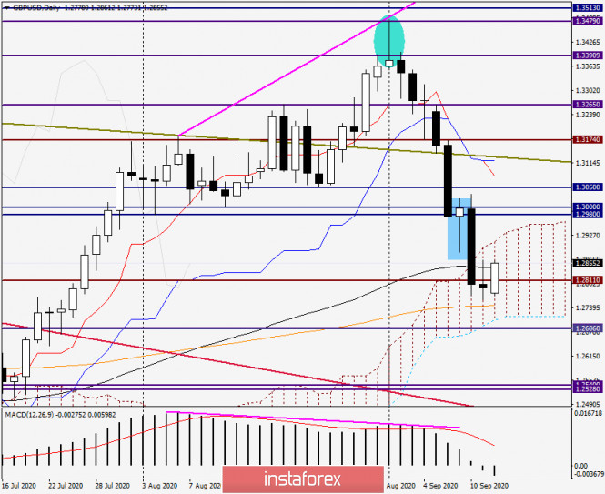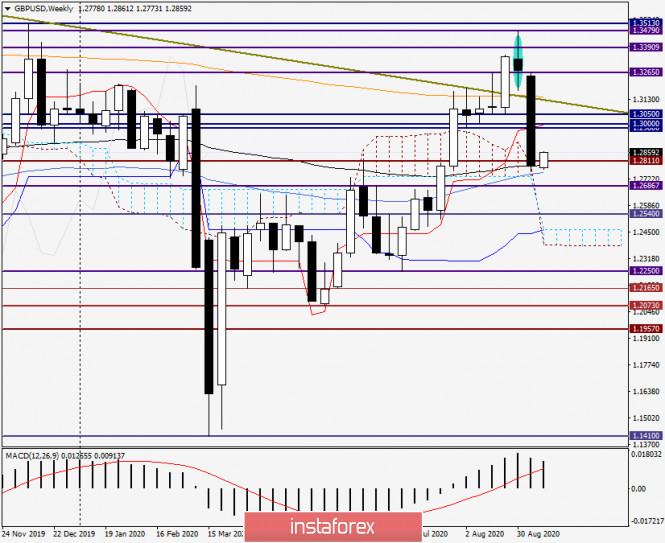 Анализ и прогноз по GBP/USD на 14 сентября 2020 годаИнстаФорекс - Instaforex, 5 лет назад Интересно, закончились ли на этом беды фунта? Приветствую уважаемых трейдеров! На торгах прошлой недели произошёл серьёзный обвал британского фунта стерлингов, который отчасти связан с нерешённой проблемой по заключению торговой сделки между Великобританией и Европейским Союзом. При этом нельзя сказать, что макроэкономические данные, которые поступают с Туманного Альбиона, разочаровывающие. Однако в фокусе участников рынка вновь оказался Brexit, который всё никак не может завершиться. Прежде чем перейти к рассмотрению графиков цены валютной пары GBP/USD, отмечу главные события, которые без сомнения окажут сильное влияние на ценовую динамику данного инструмента. Естественно, это решения по ставкам Центробанков двух стран и последующие комментарии их руководителей. В среду, в 21:00 (мск), будут объявлены итоги двухдневного заседания ФРС и опубликованы обновлённые экономические прогнозы. Через полчаса после этого состоится пресс-конференция председателя ФРС Джерома Пауэлла. Уже на следующий день эстафету подхватит Банк Англии, который в 14:00 (мск) объявит о своём решении по процентным ставкам, а также опубликует протокол заседания. Впрочем, на этой неделе будет ещё немало важной макроэкономической статистики. Торгующим британским фунтом стерлингов рекомендую обратить внимание на данные по рынку труда Великобритании, а также на индекс потребительских цен за август. Все подробности в экономическом календаре. Теперь переходим к техническому анализу gbp/usd и разбору графиков. Weekly Итак, как уже отмечалось в начале статьи, британский фунт продемонстрировал на торгах 7-11 сентября очень сильную нисходящую динамику. В отличие от евро/доллара по этой валютной паре рынок всерьёз взялся за отработку выделенной разворотной свечной модели. В результате падения пара вернулась под долгосрочную линию сопротивления 1.5817-1.3184, пробив при этом 200 экспоненциальную скользящую среднюю, которая окрашена на графике в оранжевый цвет. Но это ещё далеко не всё. Как видим, после дальнейшего снижения пара опустилась под два очень значимых уровня 1.3050 и 1.3000. В итоге торги прошедшей пятидневки завершились на 1.2791. Давненько мы не видали таких обвалов «британца». Но пользуясь своей спекулятивностью и повышенной волатильностью, стерлинг может взлетать, как ракета, и падать кирпичом, что он и продемонстрировал на прошлой неделе. Интересно, закончились ли на этом беды фунта? На прошлой неделе падение пары остановила 89 экспоненциальная скользящая средняя, а на сегодняшних торгах gbp/usd показывает рост, который, скорее всего, будет носить коррекционный характер. Впрочем, как уже отмечалось, основное влияние на ход торгов по GBP/USD окажут итоги заседаний ФРС и Банка Англии, а это значит, что надо учитывать оба сценария развития событий и рассматривать варианты для позиционирования в обоих направлениях. Daily Несмотря на выделенную прямоугольником разворотную бычью свечу, рынок полностью проигнорировал этот бычий сигнал и продолжил интенсивное движение в южном направлении. На этом графике 89 ЕМА (чёрная) не смогла сдержать давление продавцов и была пробита. Более того, цена зашла в пределы облака Ишимоку и закрепилась в нём. В моменте завершения обзора, к пробитой 89 ЕМА произошёл откат, который мо