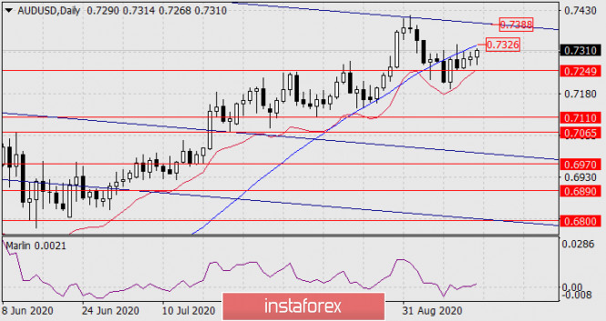 Если цене не удастся выйти над сильное сопротивление 0.7326, может последовать разворот. Здесь сигнальным уровнем является минимум 10 сентября, закрепление под ним открывает «медвежью» цель 0.7110 – минимум 12 августа.