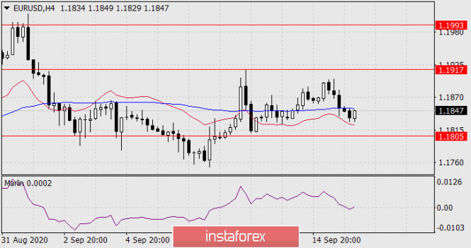 На дневном графике цена уже близко к поддержке индикаторной линии Крузенштерна. Закрепление под ней (1.1805) приведёт к снижению до первой цели 1.1650. Преодоление ценой уровня открывает вторую цель 1.1550. Также обращает на себя внимание, что сигнальная линия осциллятора Марлин не выходит за собственную нисходящую трендовую линию.