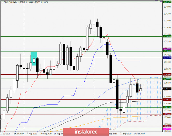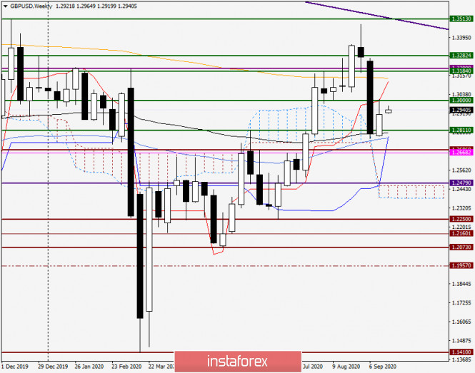 Анализ и прогноз по GBP/USD на 21 сентября 2020 годаИнстаФорекс - Instaforex, 5 лет назад Доброго времени суток, уважаемые трейдеры! На торгах прошлой недели британскому фунту стерлингов удалось немного скорректироваться по отношению к доллару США после предыдущего сильного падения. Однако ситуация по-прежнему остаётся для «британца» достаточно сложной, и прогнозы по данной валютной паре в основном носят медвежий сценарий. Негативное влияние на стерлинг продолжают оказывать опасения инвесторов относительно способности Великобритании выйти из Европейского Союза, заключив полноценную торговую сделку. Также давление на фунт оказывает позиция Банка Англии, который продолжает изучать возможность введения отрицательных процентных ставок и последствий, которые этот шаг в денежно-кредитной политике может оказать. Weekly Если перейти к разбору технической картины по GBP/USD и начать с итогов завершившейся недели, то стоит отметить, что по итогам торгов 14-18 сентября пара фунт/доллар укрепилась, завершив сессию на 1.2911. При этом характерно, что попытки быков по фунту вернуть котировку выше важнейшего психологического и технического уровня 1.3000 не увенчались успехом. Причиной этому стал и сам уровень, и линия Тенкан индикатора Ишимоку, которая преградила дальнейший путь наверх. Сейчас линия Тенкан находится уже на 1.3120, а немного выше, на 1.3140 проходит 200 экспоненциальная скользящая средняя. С технической точки зрения пока игроки на повышения курса не преодолеют ценовую зону 1.3120-1.3140, валютная пара фунт/доллар, скорее всего, продолжит сохранять медвежьи перспективы, а значит оставаться под давлением. Впрочем, и внизу в районе 1.2800-1.2765 наблюдается достаточно сильная поддержка, которая представлена 89 экспоненциальной и 50 простой скользящими средними, а также линией Киджун индикатора Ишимоку. Таким образом, для возобновления медвежьего сценария игрокам на понижение курса необходимо продавливать не только важный и сильный уровень 1.2800, но и отметку 1.2765, где находится 50 МА. По моему личному мнению, крайне важной будет цена закрытия текущих недельных торгов. Если она окажется выше 1.3000, появятся предпосылки для подъёма к более высоким ценам и тестированию на пробой сильной технической зоны 1.3120-1.3140. В противном случае велика вероятность продолжения реализации нисходящего сценария, ближайшие цели которого обозначены выше. Daily Как хорошо видно на дневном графике, все попытки пары закрепиться над облаком индикатора Ишимоку и пробиться выше 1.3000 потерпели фиаско. В результате пятничного снижения пара фунт/доллар опустилась в пределы облака, где и завершила торги 18 сентября. Данный сигнал представляется достаточно негативным и делает последующее снижение более вероятным, чем рост инструмента. Впрочем, пробой ключевой на этом таймфрейме зоны сопротивления 1.3000-1.3030, скорее всего, изменит ситуацию в пользу роста, а значит сделает реализацию бычьего сценария наиболее вероятной. Как видим, в моменте завершения данной статьи пара демонстрирует укрепление и намерения ещё раз попытаться выйти вверх из облака Ишимоку, после чего попробовать пробить уже обозначенную область сопротивления 1.3000-1.3030. Если перейти к торговым рекомендациям по GBP/USD, то наиболее актуальными на данный момент представляются продажи фунта, из ценовой зоны 1.3000-1.3030, тем более если там на бо