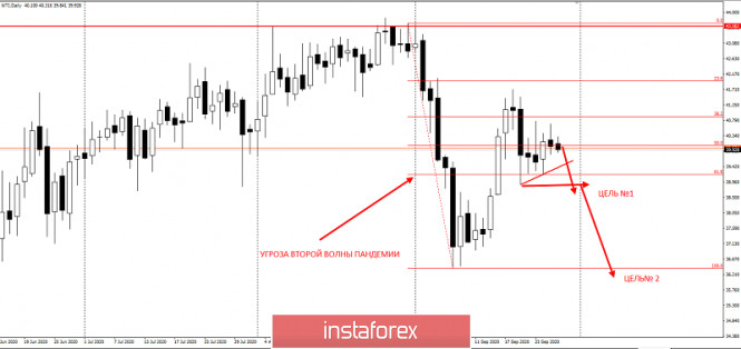 Вторая волна пандемии не даёт нефти растиИнстаФорекс - Instaforex, 5 лет назад Добрый день, уважаемые трейдеры! Представляю вашему вниманию торговую идею по нефти WTI. Итак, как и предсказывали аналитики, вторая волна пандемии началась осенью, и первые страхи были уже отыграны рынком на мощном обвале нефти в начале сентября. На мой взгляд, это только лишь фиксация лонговых позиций. Экономические последствия второй волны придут так же, как и в техническом анализе, через паузу отката, окончание которого мы наблюдаем прямо сейчас. Предлагаю рассмотреть сценарий на понижение с точки зрения новостного фона и теханализа: Фактически имеем трёхволновую структуру "АВС", где волной "А" выступает мощный обвал нефтяных цен в начале сентября. Предлагаю поработать на снижение курса стоимости нефти в третью волну с первой целью - обновления сентябрьской коррекции по котировке 38,39 и второй 36,3$ за баррель. Идея на понижение актуальна ниже котировки 41,5. Торговая идея представлена в рамках метода "Price Action" и "Охота за стопами". Материал предоставлен компанией InstaForex - www.instaforex.com |