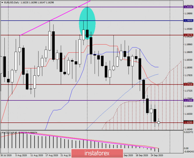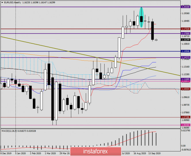 Анализ и прогноз по EUR/USD на 28 сентября 2020 годаИнстаФорекс - Instaforex, 5 лет назад Здравствуйте, уважаемые коллеги! В сегодняшнем обзоре по EUR/USD подведём итоги завершившейся в пятницу торговой недели, а также постараемся определить дальнейшие перспективы главной валютной пары и позиционирование по этому популярному торговому инструменту. Также обозначим самые главные макроэкономические события, которые ожидаются на этой неделе. Как уже не раз отмечалось ранее, обострение эпидемиологической ситуации в мире, вызванной нашествием второй волны COVID-19, послужило причиной усиленного спроса у инвесторов на доллар США, который в этой ситуации рассматривается как безопасный актив. В результате на прошлой неделе американская валюта укрепилась по отношению ко всем основным конкурентам, включая евро. Возвращаясь к теме коронавируса, стоит отметить, что в Европе идёт подготовка к второй волне пандемии, которая, судя по мнению многих экспертов-вирусологов, уже началась. Самая сложная ситуация наблюдается во Франции и в Испании. С сегодняшнего дня на 2 недели в Марселе вновь закрываются все бары и рестораны. Если ситуация не улучшится, ограничительные меры будут продлены. В случае спада суточного числа заражений COVID-19, власти пересмотрят меры по ограничению. После того как в Испании были смягчены ограничительные и санитарные меры в результате наплыва туристов, рост заболеваемости коронавирусом резко пошёл вверх. В тех областях, где суточный прирост заражений наиболее высокий, закрываются школы и увеселительные заведения. Напомню, что из европейских стран Испания наряду с Италией оказались главным очагом распространения COVID-19. Так, по подсчётам испанских властей, с начала пандемии нового типа коронавируса в стране заразились более 715 тысяч человек. Weekly Валютная пара евро/доллар завершила торги 21-25 сентября внушительным снижением, а цена закрытия составила 1.1629. Таким образом, с большой долей вероятности можно считать важнейший уровень 1.1700 пробитым. Впрочем, нельзя полностью исключать, что eur/usd не попытается вернуться выше этой важной отметки. Тем более что на этой неделе будет немало фундаментальных факторов, способных оказать влияние на ценовую динамику евро/доллара. Безусловно, главным событием недели станут трудовые отчёты из США за сентябрь, которые будут опубликованы в последний день торгов, 2 октября. Также на этой неделе рынок будет закрывать сентябрь, и здесь мы, скорее всего, увидим борьбу за цену закрытия относительно уровня 1.1700. Если же характеризовать техническую картину на недельном графике, то по EUR/USD сохраняются все предпосылки для продолжения нисходящего движения. Если так и произойдёт, то ближайшими целями внизу станут 1.1600, 1.1570, 1.1540 и 1.1500. В случае коррекционного сценария, который подразумевает укрепление котировки, пара может подняться в ценовую зону 1.1700-1.1743, где находятся уже неоднократно упомянутый важный уровень 1.1700, а также пробитая поддержка в районе 1.1743. Daily На дневном графике в минувшую пятницу пара продолжила движение к нижней границе облака Ишимоку, прямо над которой находится 89 экспоненциальная скользящая средняя, а также 50-й уровень фибо от роста 1.1167-1.2010. Таким образом, рекомендую внимательно понаблюдать за поведением цены при снижении в область 1.1600-1.1566. Если в обозначенной области появятся разворотные бы